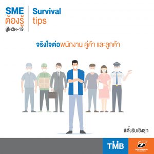 ในส่วนของลูกค้า หากสถานการณ์ส่งผลกระทบถึงการบริการ ซึ่งอาจจะล่าช้ากว่าปกติ หรือมีสิ่งที่ไม่เป็นไปตามที่ลูกค้าเคยได้รับ ผู้ประกอบการ SME จะต้องแจ้งลูกค้าเพื่อให้ได้รับทราบก่อนที่จะได้รับสินค้าและบริการ