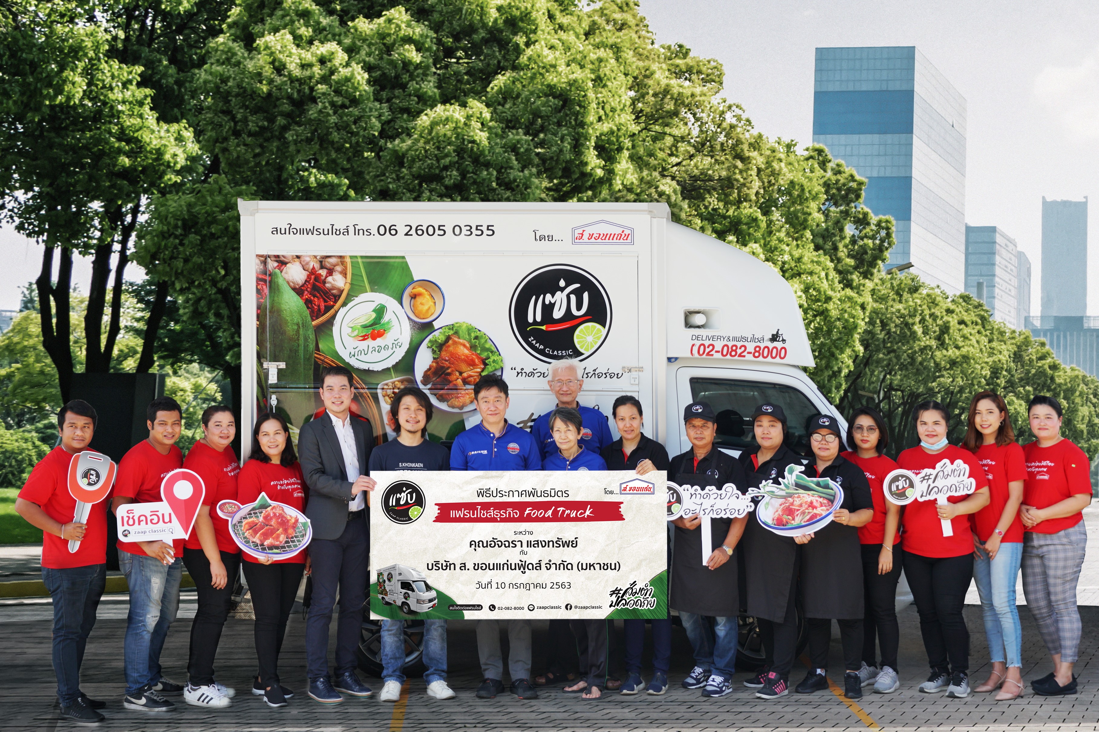 21 กรกฎาคม 2563 : นายจรัสภล รุจิราโสภณ (ที่ 6 จากซ้าย) ประธานเจ้าหน้าที่บริหาร ธุรกิจอาหารพร้อมรับประทาน (RTE-QSR) บริษัท ส. ขอนแก่นฟู้ดส์ จำกัด (มหาชน) หรือ SORKON แต่งตั้ง คุณอัจฉรา แสงทรัพย์ (ที่ 8 จากซ้าย) เป็นแฟรนไชส์ฟู้ดทรัค (food truck) แบรนด์ ‘แซ่บคลาสสิก’ โดยนับเป็นแฟรนไชส์ฟู้ดทรัคคันที่ 3 หลังได้รับกระแสตอบรับจากคู่ค้าที่ให้ความสนใจเป็นจำนวนมาก ด้วยงบลงทุนไม่สูงและได้รับประโยชน์จากผลตอบแทนการลงทุนที่คุ้มค่า มีโอกาสคืนทุนภายในระยะเวลาไม่ถึง 2 ปี นอกจากนี้ ยังเป็นการยกระดับคุณภาพอาหาร Street food ให้ถูกสุขลักษณะ ปลอดภัย เพื่อให้ลูกค้าได้รับประทานอย่างมั่นใจ สะดวกเข้าถึงง่าย ตามวิสัยทัศน์การเป็นบริษัทผลิตอาหารไทยเพื่อทุกชีวิตที่ดีขึ้น ![]()