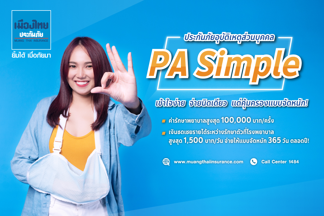 ที่สำคัญสามารถเข้ารับการรักษาตัวในโรงพยาบาลได้ไม่จำกัดจำนวนครั้ง ด้วยเบี้ยประกันภัยเริ่มต้นที่ 270 บาท/เดือน และประกันภัยอุบัติเหตุ PA Simple มอบค่ารักษาพยาบาลจากอุบัติเหตุ สูงสุด 100,000 บาท/ครั้ง พร้อมเงินชดเชยรายได้ระหว่างรักษาตัวที่โรงพยาบาลสูงสุด 1,500 บาท/วัน เบี้ยประกันภัยเริ่มต้นเพียง 225 บาท/เดือน (ระยะเวลาความคุ้มครอง 1 ปี)