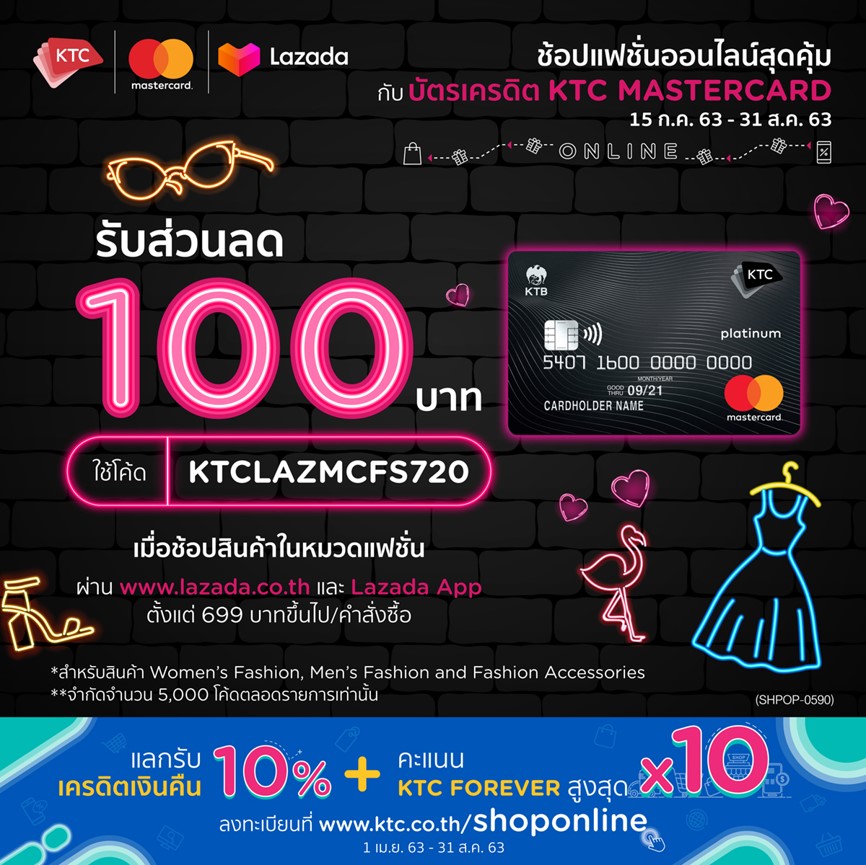 27 กรกฎาคม 2563 : “เคทีซี” หรือ บริษัท บัตรกรุงไทย จำกัด (มหาชน) จัดสิทธิพิเศษสำหรับสมาชิกบัตรเครดิต เคทีซี-มาสเตอร์การ์ดทุกประเภท รับส่วนลดทันที 100 บาท เมื่อช้อปออนไลน์ในหมวดแฟชั่นสตรีและบุรุษ รวมถึงเครื่องประดับแฟชั่นต่างๆ ตั้งแต่ 699 บาทขึ้นไปต่อยอดซื้อสุทธิ ผ่านเว็บไซต์ www.lazada.co.th และแอปพลิเคชัน “LAZADA” โดยระบุรหัสส่วนลด “KTCLAZMCFS720” (จำกัดสูงสุด 5,000 โค้ด) ตั้งแต่วันที่ 15 กรกฎาคม 2563 – 31 สิงหาคม 2563 พิเศษ แลกรับเครดิตเงินคืน 10% เมื่อใช้คะแนน KTC FOREVER เท่ายอดซื้อต่อรายการ และรับคะแนน KTC FOREVER สูงสุด 10 เท่า (คะแนนปกติ 1 เท่า และคะแนนพิเศษ 9 เท่า) ตั้งแต่วันที่ 1 เมษายน 2563 – 31 สิงหาคม 2563