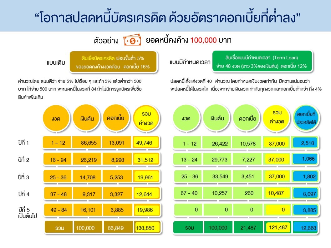 หนึ่ง สมมติพวกเรา มียอดหนี้คงค้างบัตรเครดิต 100,000 บาท ปกติจ่ายขั้นต่ำงวดละ 5% ราวๆ 5,000 บาท แต่ถ้าแปลงเป็น term loan ผ่อน 48 งวด ดอกเบี้ย 12% ตกเดือนละ 3,000 บาท ในช่วงปีแรก ภาระการจ่ายจะลดลง จากราวๆ 49,700 บาท เหลือ 37,000 บาท แถมดอกเบี้ยก็ยังต่ำกว่าถึง 2,500 บาท