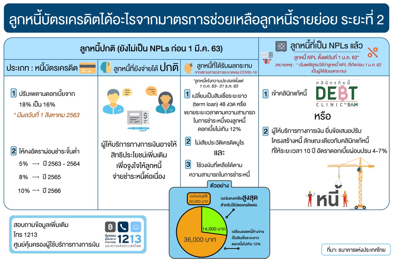 ต่อมามีเสียงสะท้อนมากขึ้นว่า อัตราดอกเบี้ยบัตรเครดิตยังอยู่ในระดับสูง หากเป็นไปได้ น่าจะมีทางเลือกที่หลากหลายที่ช่วยเพิ่มสภาพคล่องระยะสั้น และช่วยให้เห็นแสงสว่างที่จะปลดหนี้ ไปพร้อมๆกัน เพราะลูกหนี้บัตรจำนวนไม่น้อย ได้เพียรพยายามผ่อนจ่ายและมีวินัยมาโดยตลอด ซึ่งก็ยังมีอีกจำนวนมากที่ไปไม่ไหวและต้องกลายเป็น NPL ซึ่งถึงคราวจำเป็นแล้วที่จะต้องช่วยหาทางออกให้เขาได้เริ่มต้นชีวิตใหม่เราคนไทยด้วยกันจะทิ้งกันได้อย่างไร ความเห็นและข้อเสนอแนะเหล่านี้ ได้นำมาสู่มาตรการช่วยเหลือลูกหนี้รายย่อย ระยะที่ 2 ของ ธปท.