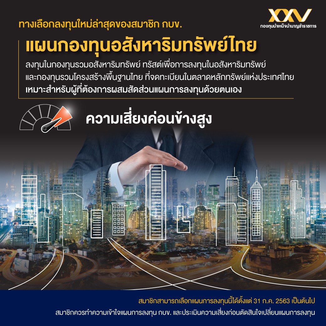 31 กรกฎาคม 2563 : นายบุญเลิศ อันประเสริฐพร รองเลขาธิการ กลุ่มงานปฏิบัติการ รักษาการในตำแหน่งเลขาธิการคณะกรรมการกองทุนบำเหน็จบำนาญข้าราชการ (กบข.) เปิดเผยว่า กบข. เพิ่มทางเลือกการลงทุนให้กับสมาชิกในการบริหารเงินออม โดยล่าสุด ณ 31 กรกฎาคม 2563 ได้ออกแผนกองทุนอสังหาริมทรัพย์ไทย ที่มีสัดส่วนสินทรัพย์ 100% ลงทุนในกองทุนรวมอสังหาริมทรัพย์ไทย ทรัสต์เพื่อการลงทุนในอสังหาริมทรัพย์ไทย และกองทุนรวมโครงสร้างพื้นฐานไทยที่จดทะเบียนในตลาดหลักทรัพย์แห่งประเทศไทย ซึ่งจะสร้างโอกาสได้รับผลตอบแทนจากการลงทุนแบบเฉพาะเจาะจงในกลุ่มอสังหาริมทรัพย์ อย่างไรก็ตาม แผนการลงทุนนี้มีความเสี่ยงที่มูลค่าต่อหน่วยหรือ NAV จะลดลงตามภาวะตลาดหุ้นไทย และปัจจัยอื่นๆ ที่กระทบต่อธุรกิจอสังหาริมทรัพย์ที่แผนการลงทุนนำเงินไปลงทุน
