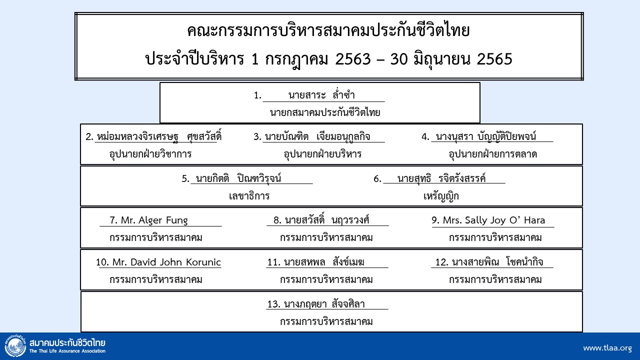 31 กรกฎาคม 2563 : นายสาระ ล่ำซำ นายกสมาคมประกันชีวิตไทย รับมอบช่อดอกไม้แสดงความยินดีจาก นางนุสรา (อัสสกุล) บัญญัติปิยพจน์ อดีตนายกฯ เนื่องในโอกาสที่ นายสาระ ได้รับความไว้วางใจเป็นสมัยที่ 5 จากคณะกรรมการสมาคมเป็นเอกฉันท์ ให้ดำรงตำแหน่งนายกสมาคมประกันชีวิตไทย ประจำปีบริหาร 1 กรกฎาคม 2563 – 30 มิถุนายน 2565 ในการประชุมใหญ่สามัญประจำปี 2563 เมื่อวันที่ 31 กรกฎาคม 2563 ณ โรงแรมสวิสโฮเต็ล กรุงเทพฯ รัชดา โดยคณะกรรมการชุดใหม่พร้อมผลักดันและสานต่อให้ธุรกิจเจริญเติบโตอย่างต่อเนื่องมั่นคงต่อไป ![]()