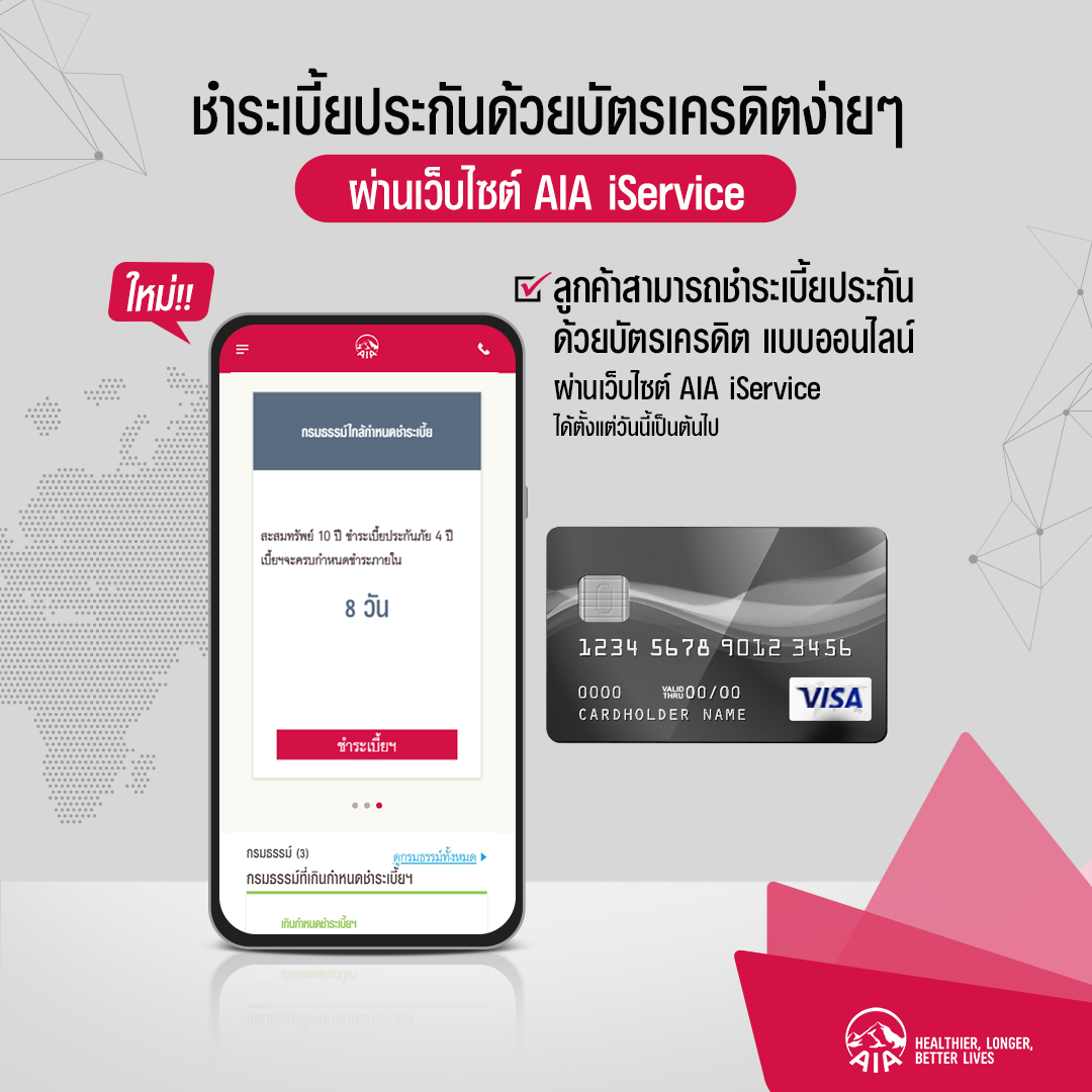 “สำหรับการชำระเงินผ่านเว็บไซต์ AIA iService ลูกค้าสามารถตรวจสอบวันครบกำหนดชำระเบี้ยประกันภัยได้ตลอดเวลา และสามารถเลือกชำระเบี้ยประกันภัยได้ 30 วันล่วงหน้าก่อนถึงวันครบกำหนดชำระเบี้ยประกันภัย หรือไม่เกิน 31 วันหลังจากวันครบกำหนดชำระเบี้ยประกันภัย ซึ่งสามารถเลือกชำระด้วยบัตรเครดิต VISA, MasterCard หรือ JCB ที่ออกโดยธนาคารในประเทศไทยได้ทุกแห่ง โดยระบบจะแสดงผลการชำระเงินให้ลูกค้าทราบทันทีเมื่อทำรายการสำเร็จพร้อมทั้งส่งอีเมลและ SMS ยืนยันการชำระเงินให้แก่ลูกค้า เพื่อเพิ่มความมั่นใจในด้านความปลอดภัยแก่ลูกค้า