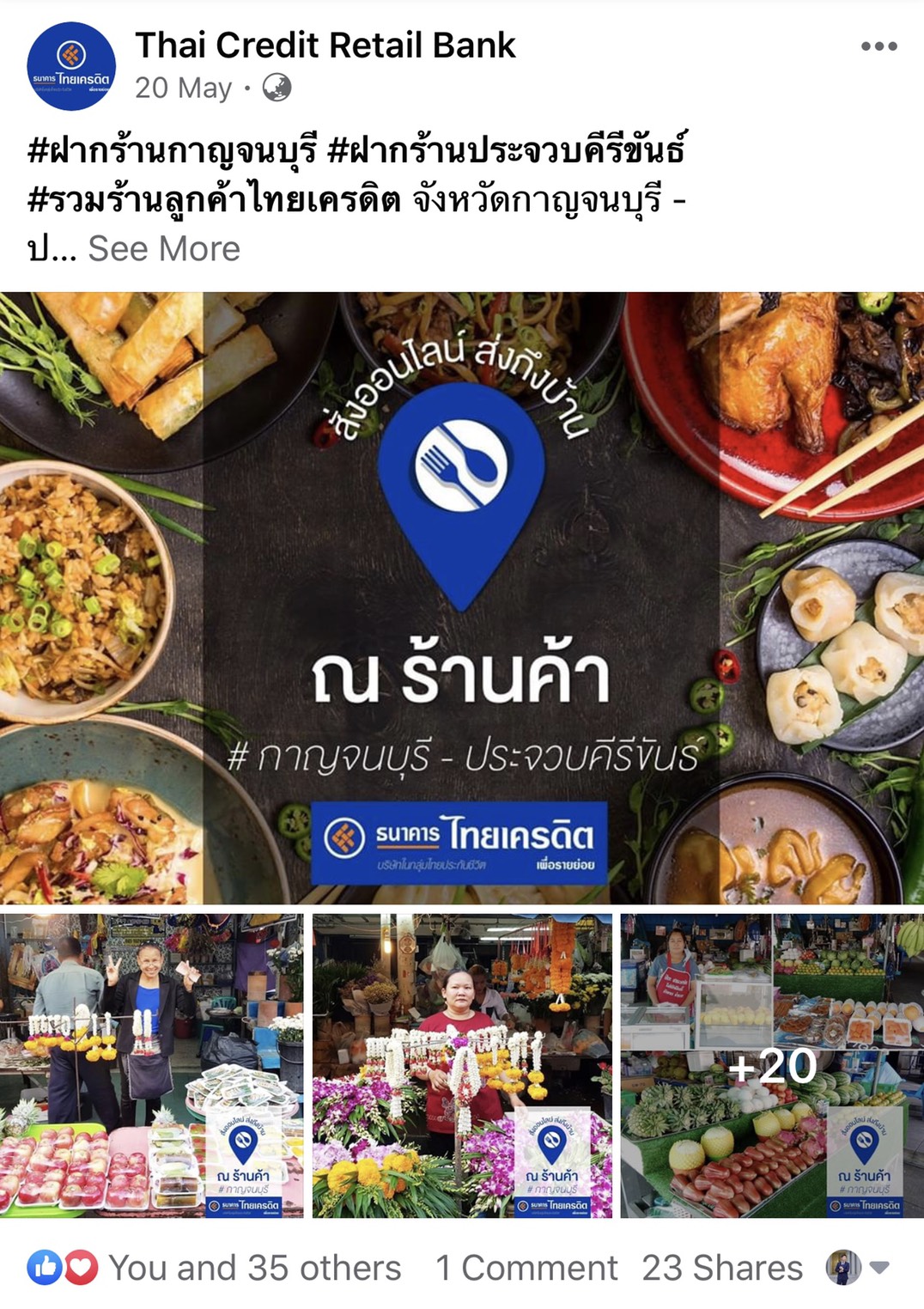 แม้สถานการณ์จะดูเหมือนคลี่คลายบ้างแล้วในปัจจุบัน แต่ก็ยังมีการเฝ้าจับตาการเกิดระลอกสอง และเศรษฐกิจก็ยังช้ำลากยาวถึงปีหน้า ทำให้คนยังกำเงิน ซื้อขายน้อยลงอยู่ เพื่อเป็นการกระตุ้นและเพิ่มรายได้ให้กับพ่อค้าแม่ค้าในสภาวะที่ไม่แน่นอนนี้ ธนาคารจึงได้เปิดช่องทางโปรโมตร้านค้าทางเพจเฟซบุ๊กของธนาคารให้พ่อค้าแม่ค้าฟรีตั้งแต่เกิดสถานการณ์จนถึงปัจจุบัน เพื่อเป็นการสร้างการรับรู้ แนะนำร้านลูกค้าให้เป็นที่รู้จัก ซึ่งในเพจจะมีการลงรูป ชื่อและที่ตั้งร้าน พร้อมเบอร์ติดต่อและช่องทางโซเชียล เพื่อให้ผู้บริโภคในพื้นที่ที่สนใจสามารถสั่งอาหาร หรือสั่งเดลิเวอรี่ได้”