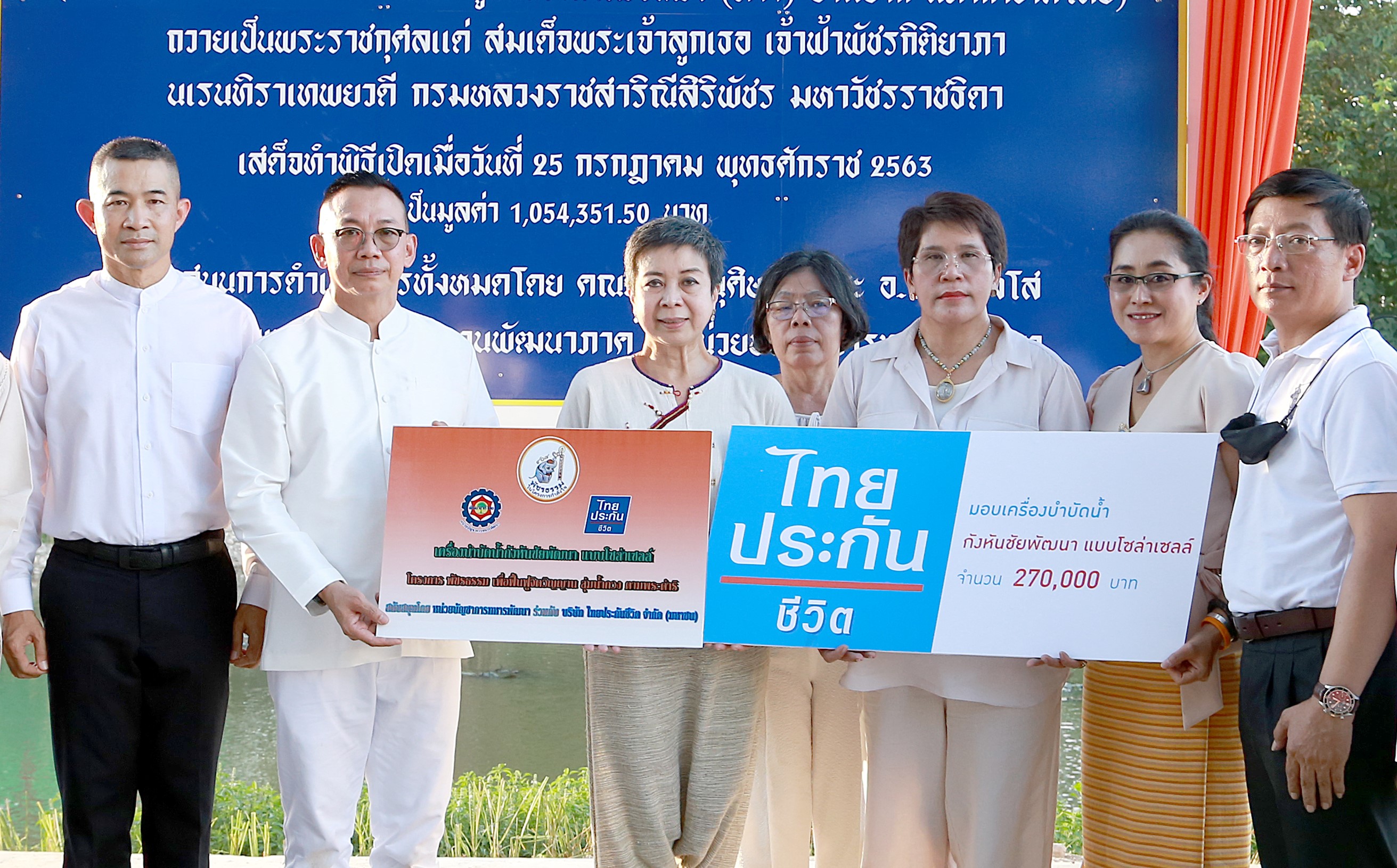 6 สิงหาคม 2563 : ปาณี เจียรดิฐ ผู้อำนวยการสายงาน สายงานส่งเสริมกิจกรรมองค์กรเพื่อสังคม บริษัท ไทยประกันชีวิต จำกัด (มหาชน) เป็นผู้แทนบริษัทฯ มอบเครื่องบำบัดน้ำกังหันชัยพัฒนา แบบโซล่าเซลล์ พร้อมชุดอุปกรณ์ รวมมูลค่า 270,000 บาท แก่โครงการพัชรธรรมเพื่อฟื้นฟูจิตวิญญาณลุ่มน้ำกวง ตามแนวทางพระราชดำริ ในเครือข่ายการบริหารจัดการน้ำ มูลนิธิอาสาเพื่อนพึ่ง (ภาฯ) ยามยาก สภากาชาดไทย สำหรับใช้แก้ปัญหาน้ำเน่าเสียในแม่น้ำกวง ซึ่งเป็นแม่น้ำสายหลักในจังหวัดลำพูน โดยมีพลโทสัณทัศน์ นันทิภาคย์หิรัญ รองผู้บัญชาการหน่วยบัญชาการทหารพัฒนา กองบัญชาการกองทัพไทย เป็นผู้รับมอบ ณ บ้านวังไฮ จังหวัดลำพูน ![]()
