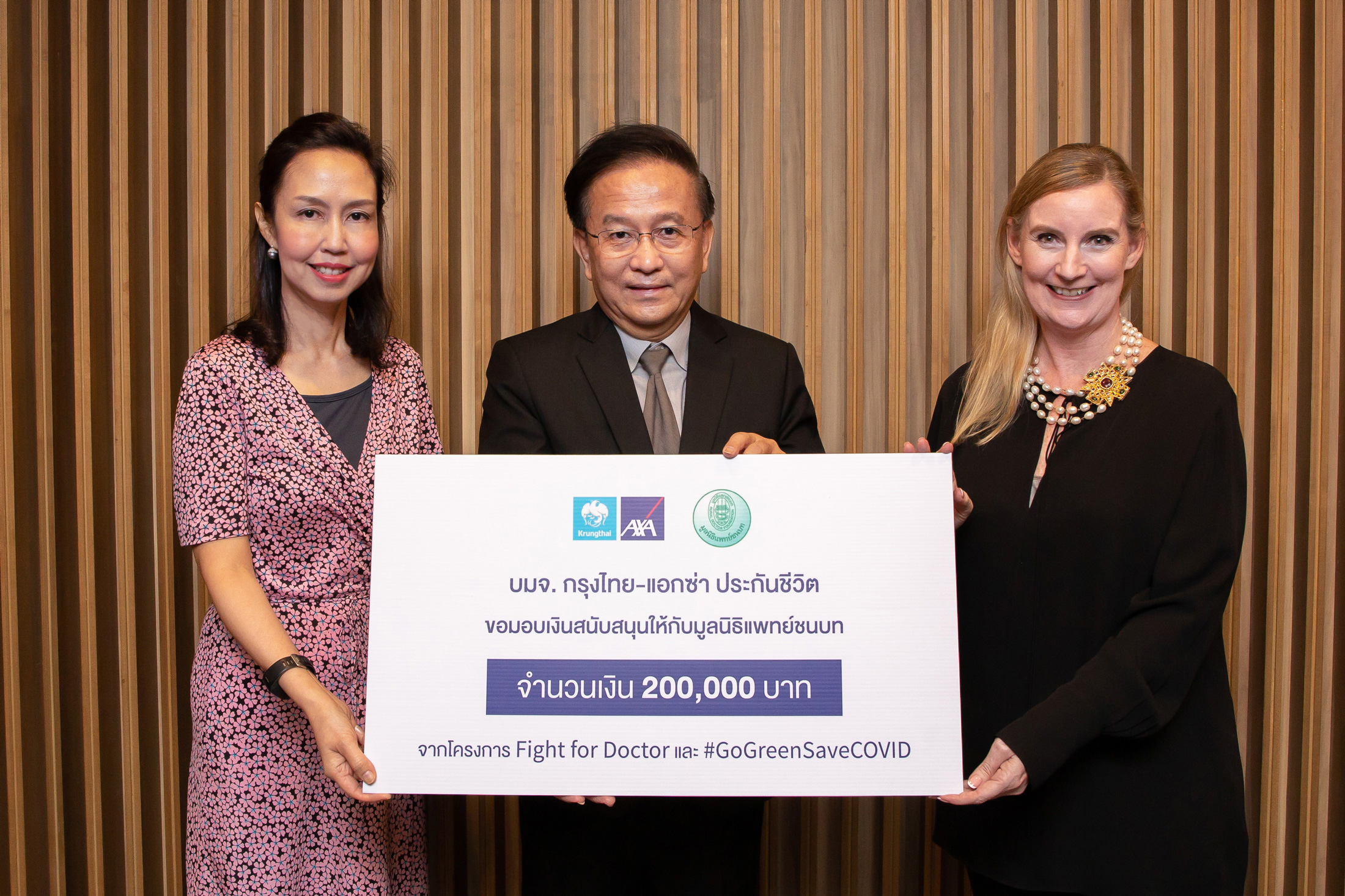 7 สิงหาคม 2563 : บมจ.กรุงไทย-แอกซ่า ประกันชีวิต นำโดย แซลลี่ โอฮาร่า ประธานเจ้าหน้าที่บริหาร (คนขวา) พร้อม ภควิภา เจริญตรา ประธานเจ้าหน้าที่บริหาร ฝ่ายลูกค้า (คนซ้าย) มอบเงินสนับสนุน จำนวน 200,000 บาท จากโครงการ Fight for Doctor และโครงการ #GOGreenSaveCOVID-19 สนับสนุนมูลนิธิแพทย์ชนบท โดยมี นพ.ชูชัย ศุภวงศ์ ประธานมูลนิธิแพทย์ชนบท (คนกลาง) รับมอบ ณ สำนักงานใหญ่ อาคาร จี ทาวเวอร์ ถ.พระราม 9 เมื่อเร็วๆ นี้