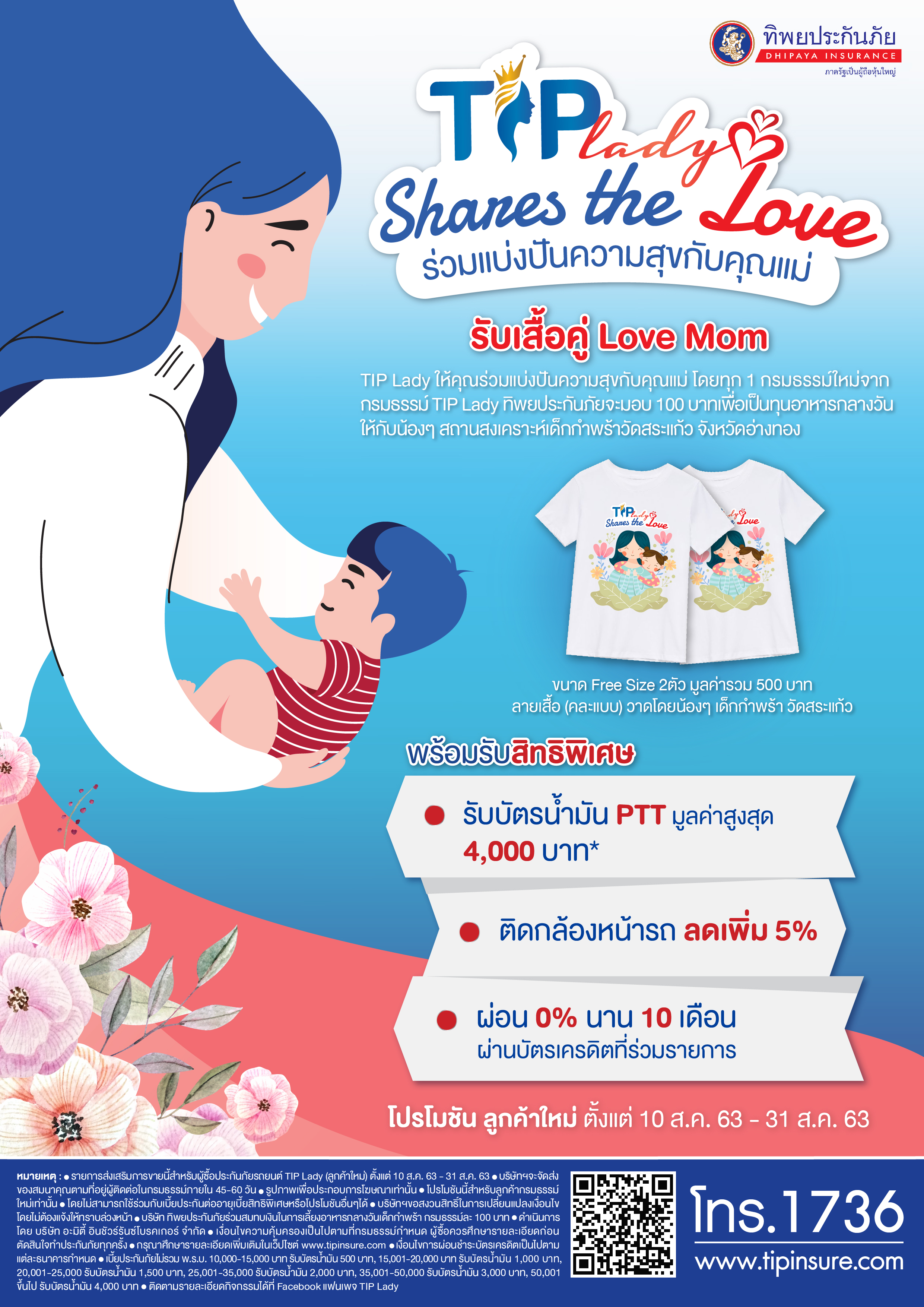 10 สิงหาคม 2563 : ทิพยประกันภัย ชวนคุณมอบความสุขตลอดเดือนสิงหาคมเดือนแห่งวันแม่ “TIP Lady Shares the Love” กับประกันภัยรถยนต์ TIP Lady ให้มากกว่าประกันชั้น 1 ให้คุณร่วมแบ่งปันความสุขกับคุณแม่ โดยทุก 1 กรมธรรม์ใหม่ของ TIP Lady ตั้งแต่วันที่ 10 – 31 สิงหาคม 2563 ทิพยประกันภัยจะมอบ 100 บาทเพื่อเป็นทุนอาหารกลางวันให้กับน้องๆ สถานสงเคราะห์เด็กกำพร้าวัดสระแก้ว จังหวัดอ่างทอง นอกจากนี้ยังมีโปรโมชั่นดีๆถึง 4 ต่อคือ