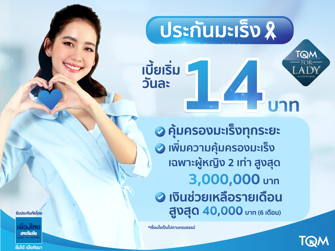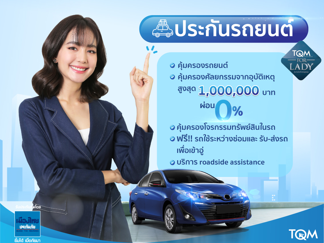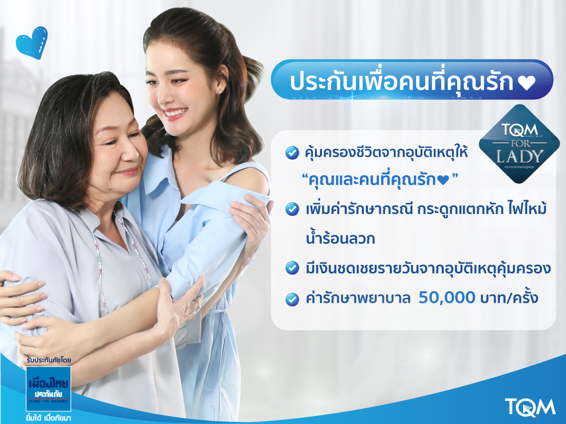 ทั้งนี้ เนื่องในโอกาสพิเศษ “วันแม่แห่งชาติ” ร่วมส่งมอบความห่วงใยด้วย “ประกันอุบัติเหตุเพื่อคนที่คุณรัก” ที่คุ้มครองทั้งตัวคุณและคนรัก ซื้อ 1 ได้ถึง 2 กรมธรรม์ ผ่าน TQM Insurance Gifts พร้อมสิทธิประโยชน์ผ่อน 0% มีรถใช้ระหว่างซ่อม บริการ Roadside Service มั่นใจแคมเปญ For Lady เจาะตลาดกลุ่มผู้หญิงตั้งเป้าโค้งสุดท้าย 150 ล้านบาทในปีนี้
