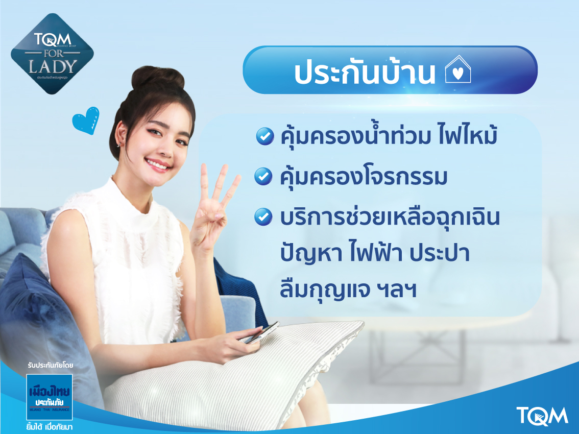 “ประกันบ้านสำหรับผู้หญิง” ให้คุณผู้หญิงหมดกังวลเรื่องบ้าน คุ้มครองการโจรกรรม น้ำท่วม ไฟไหม้ และภัยพิบัติจากธรรมชาติ พร้อมบริการ Home Assistance ช่วยเหลือฉุกเฉินงานซ่อมแซม ปัญหาไฟฟ้า ประปา ลืมกุญแจบ้าน ฯลฯ