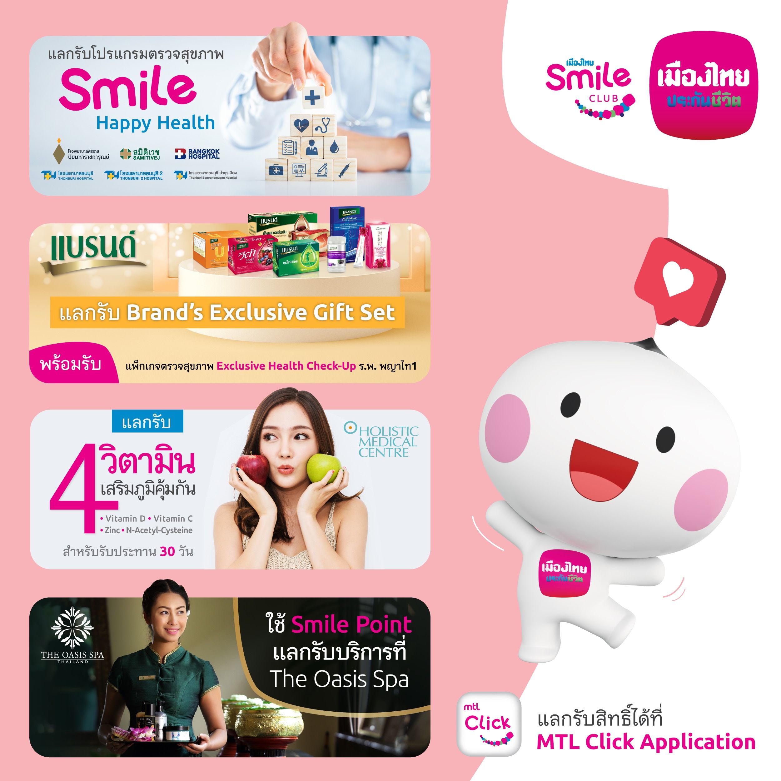 สมาชิกเมืองไทยสไมล์คลับสามารถใช้คะแนนสะสม Smile Point แลกรับส่วนลด และแลกรับสินค้าได้อีกมากมายและติดตามกิจกรรมรวมถึงสิทธิประโยชน์สุดพิเศษได้ตลอดทั้งปีเพิ่มเติมได้ที่ MTL Click Application ดาวน์โหลดได้ฟรีทั้งระบบปฏิบัติการ iOS และ Android หรือเว็บไซต์ www.muangthai.co.th ลูกค้าสอบถามรายละเอียดเพิ่มเติม โทร.1766 ทุกวัน ตลอด 24 ชั่วโมง ![]()