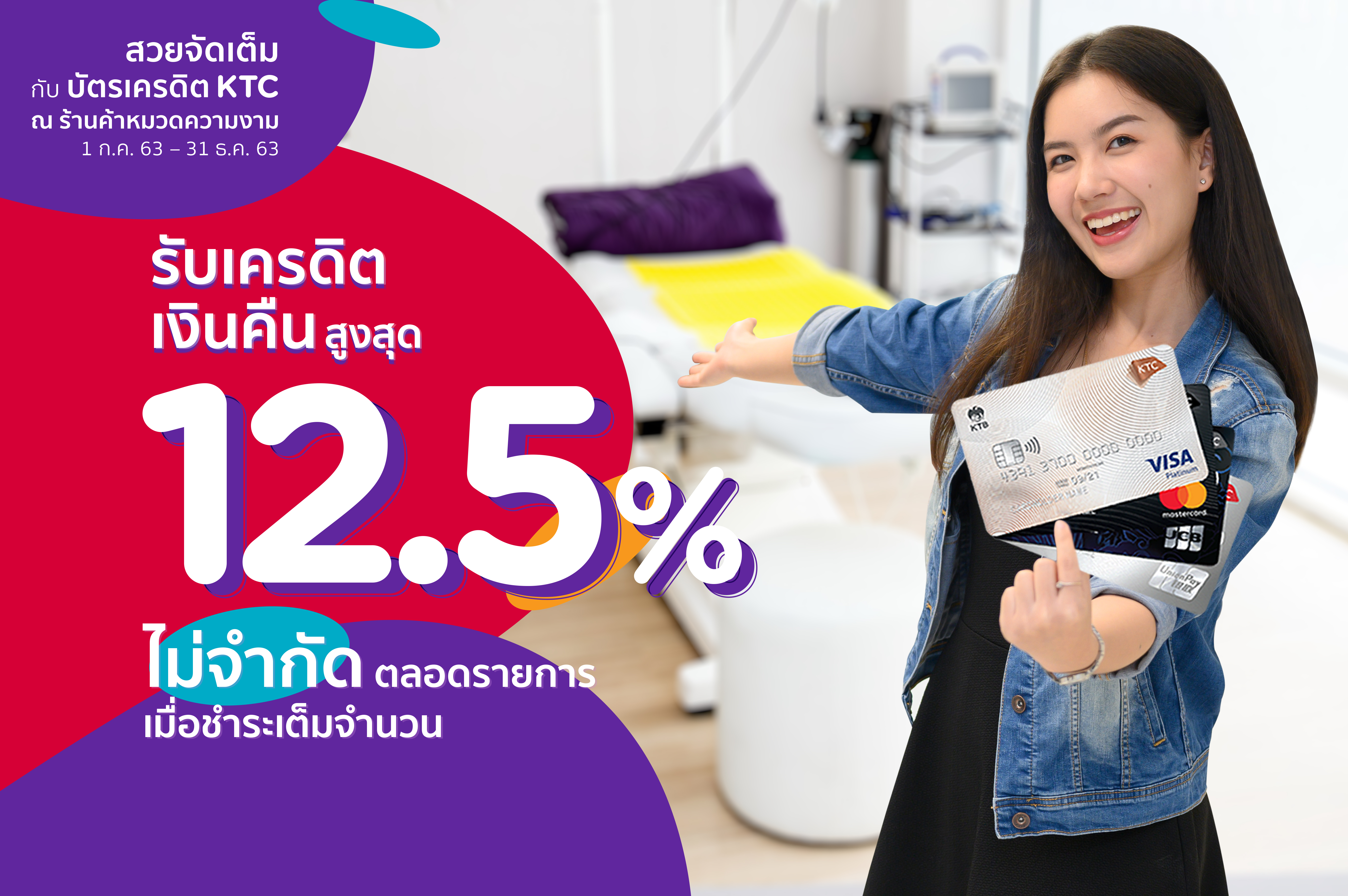 11 สิงหาคม 2563 : “เคทีซี” หรือ บริษัท บัตรกรุงไทย จำกัด (มหาชน) ร่วมกับพันธมิตรร้านค้าความงามทั่วประเทศจัดโปรโมชัน “สวยจัดเต็ม รับเครดิตเงินคืนสูงสุด 12.5% เมื่อใช้จ่ายเต็มจำนวน กับบัตรเครดิต KTC” มอบ 2 สิทธิพิเศษ 1) รับเครดิตเงินคืน 0.5% เมื่อมียอดใช้จ่ายเต็มจำนวนผ่านบัตรเครดิตเคทีซีตั้งแต่บาทแรก และลงทะเบียนเข้าร่วมรายการเพียงครั้งเดียวภายในวันที่มียอดใช้จ่าย 2) แลกรับเครดิตเงินคืนเพิ่ม 12% เมื่อมียอดใช้จ่ายเต็มจำนวนผ่านบัตรเครดิตเคทีซีครบทุก 1,000 บาทต่อเซลส์สลิป และใช้คะแนน KTC FOREVER ทุก 1,000 คะแนน แลกรับเครดิตเงินคืน 120 บาท (ไม่จำกัดยอดแลกคะแนน) โดยลงทะเบียนทุกครั้งที่ทำรายการภายในวันที่มียอดใช้จ่าย ตั้งแต่วันที่ 1 กรกฎาคม 2563 – 31 ธันวาคม 2563 ![]()