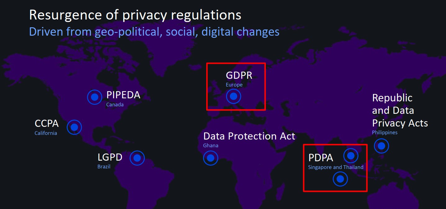 ขณะที่ไทยเองได้มีการวางมาตรฐานใหม่ในการคุ้มครองข้อมูลและความมั่นคงทางไซเบอร์ผ่านกฎหมายสำคัญ 2 ฉบับ ได้แก่ พรบ. การรักษาความมั่นคงปลอดภัยไซเบอร์ พ.ศ. 2562 ในการกำหนดมาตรการหรือแผนดำเนินงานสำหรับรับมือ ป้องกัน หรือลดความเสี่ยงจากภัยคุกคามไซเบอร์จากในและนอกประเทศ รวมทั้งให้อำนาจรัฐในการร่วมสืบสวนตรวจสอบกรณีมีภัยคุกคามเกิดขึ้น และ พรบ. คุ้มครองข้อมูลส่วนบุคคล พ.ศ. 2562 (Personal Data Protection Act – PDPA) ซึ่งเป็นการออกกฎหมายที่อ้างอิง GDPR บนหลักการสำคัญ 3 ประการ คือ การปกป้องข้อมูล (Data Privacy) การป้องกันการรั่วไหลของข้อมูล (Data Breaches) และการประมวลผลหรือการดำเนินการใด ๆ เกี่ยวกับข้อมูลต้องได้รับ การยินยอม (Consent) จากเจ้าของข้อมูล