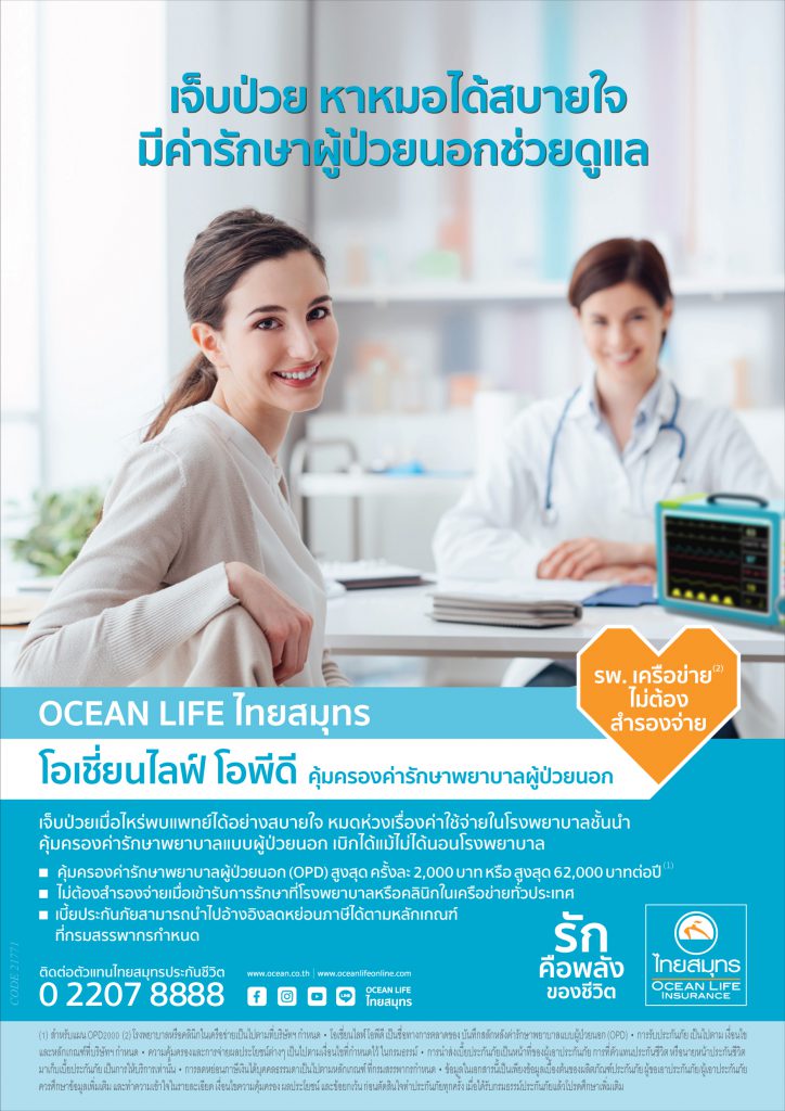 14 สิงหาคม 2563 : บมจ.ไทยสมุทรประกันชีวิต รักคือพลังของชีวิต โดย นางนุสรา (อัสสกุล) บัญญัติปิยพจน์ กรรมการผู้จัดการ ร่วมดูแลคนไทยให้ใช้ชีวิตทำสิ่งที่รักได้อย่างเต็มที่ และทำให้การไปโรงพยาบาลเป็นเรื่องง่าย ด้วยแบบประกันใหม่ล่าสุด! “โอเชี่ยนไลฟ์ โอพีดี” คุ้มครองค่ารักษาพยาบาลผู้ป่วยนอก (OPD) ให้คุณเบิกค่ารักษาพยาบาลเมื่อต้องพบแพทย์ยามเจ็บป่วยโดยไม่ต้องนอนโรงพยาบาล พร้อมให้คุณหมดกังวลจากค่าใช้จ่ายการรักษาพยาบาลในโรงพยาบาลชั้นนำ และไม่ต้องสำรองจ่าย หากเข้ารับการรักษาที่โรงพยาบาลหรือคลินิกในเครือข่าย OCEAN LIFE ไทยสมุทร จำนวนกว่า 500 แห่งทั่วประเทศ