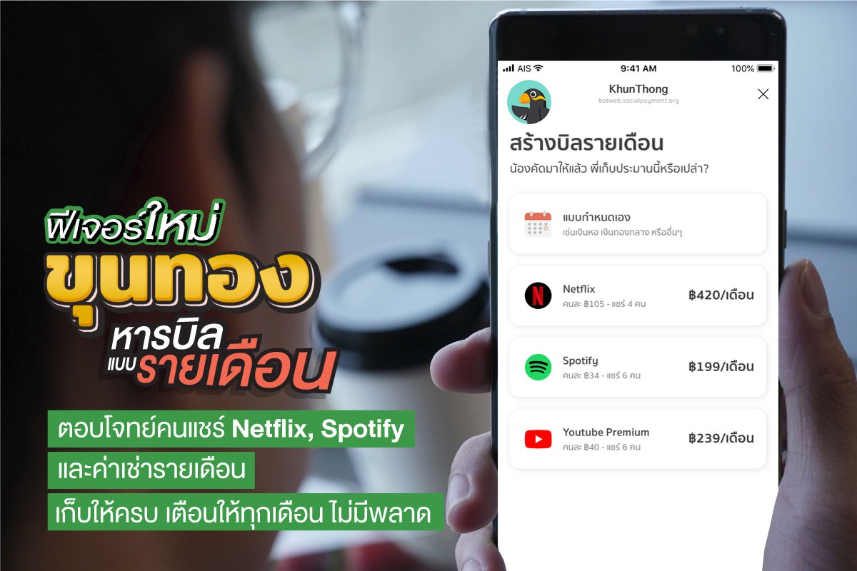 โดยฟีเจอร์ดังกล่าวของขุนทองจะช่วยเตือนเมื่อถึงเวลาต้องจ่ายบิลเหล่านี้ เพียงแอดไลน์ @KhunThong เชิญขุนทองเข้ากลุ่มแชท จากนั้นพิมพ์ ‘ขุนทอง’ ในแชท แล้วเลือกสร้างบิลจากเมนู ‘เก็บรายเดือน’ ผู้ใช้งานก็สามารถกำหนดวัน เวลา ที่ให้ขุนทองแจ้งเตือน รวมถึงเลือกได้ว่าให้เก็บเงินทุก ๆ กี่เดือน เป็นระยะเวลานานเท่าไหร่ และสามารถกำหนดจำนวนเงินที่แต่ละคนต้องจ่ายได้ โดยเมื่อถึงเวลาขุนทองจะแจ้งเตือนในไลน์และตามเก็บเงินให้จนครบเพื่อให้ทุกคนจ่ายบิลได้ตรงเวลา แต่หากมีใครขาดจ่ายเดือนใดเดือนหนึ่ง ขุนทองจะช่วยทบยอดให้ไปในเดือนถัดไป เพื่อให้มั่นใจได้ว่าผู้สร้างบิลจะสามารถเก็บเงินได้ครบเต็มจำนวน