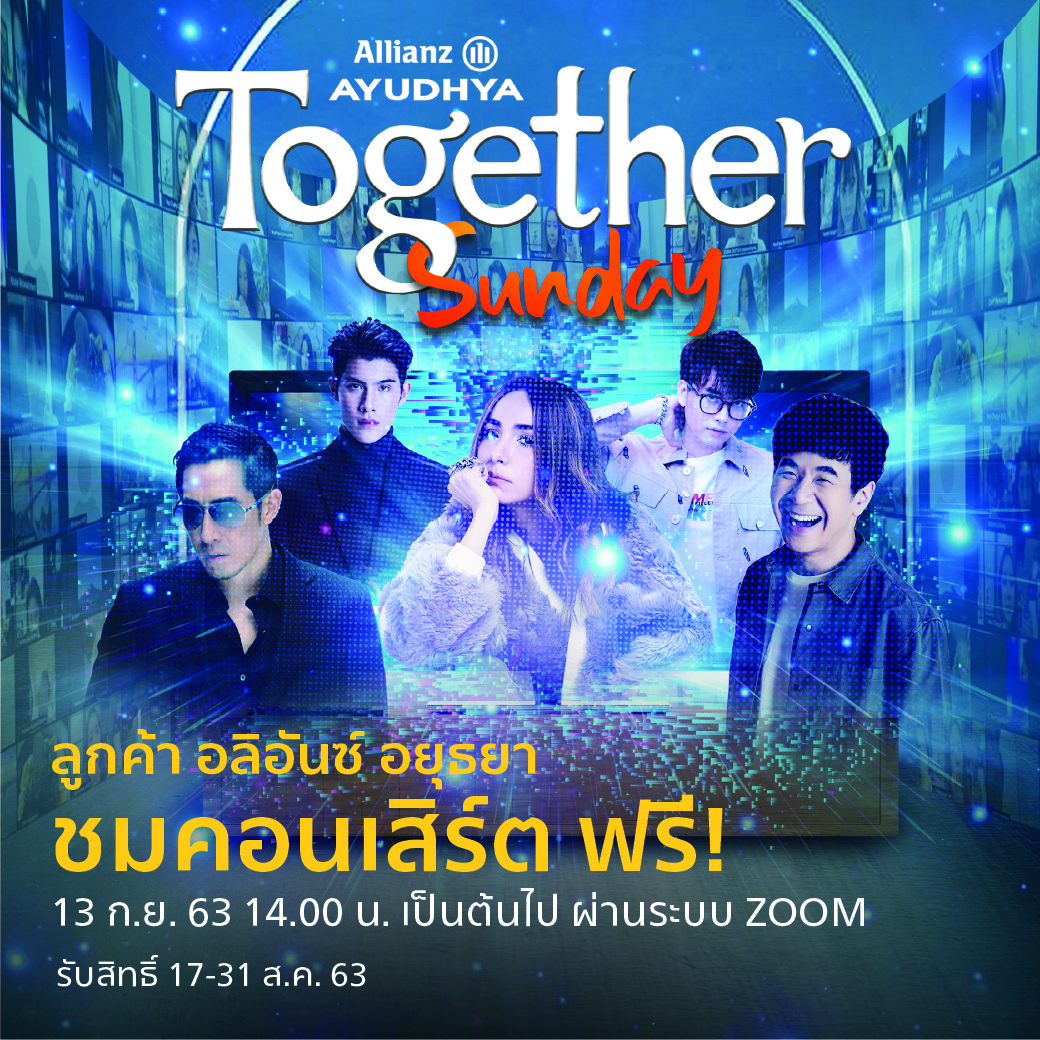 19 สิงหาคม 2563 : อลิอันซ์ อยุธยา เดินหน้าส่งต่อความห่วงใย พร้อมตอกย้ำตำแหน่งผู้นำด้านดิจิทัล จัดกิจกรรม Together Sunday Live Online Concert คอนเสิร์ตในรูปแบบออนไลน์ กิจกรรมวิถีใหม่ที่ให้ลูกค้าสนุกได้ แม้ในเวลาที่ต้องรักษาระยะห่าง โดยขน 5 ศิลปินดัง สแตมป์ อภิวัชร์ นนท์ ธนนท์ ปาล์มมี่ เจ เจตริน และเจ้านาย ส่งมอบความสุขตลอดสองชั่วโมงเต็ม คาดมีลูกค้าเข้าร่วมกว่า 5,000 ครอบครัว ลูกค้าอลิอันซ์ อยุธยา ลงทะเบียนร่วมกิจกรรมได้ตั้งแต่ วันที่ 17 สิงหาคม – 31 สิงหาคม 2563 และเตรียมตัวให้พร้อมกับความสนุกสุดขีดที่บ้านใน วันอาทิตย์ ที่ 13 กันยายน 2563 เวลา 14.00 น.เป็นต้นไป