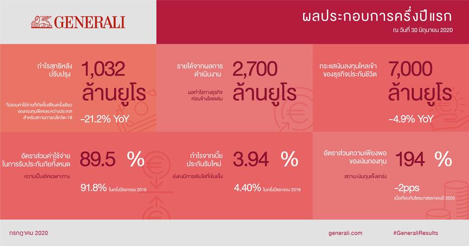 19 สิงหาคม 2563 : เจนเนอราลี่ ไทยแลนด์ เผยผลประกอบการครึ่งปีแรกฝ่าวิกฤตโควิด เติบโตกว่าปีก่อน โดยเฉพาะประกันสุขภาพและอุบัติเหตุเพิ่มขึ้นร้อยละ 11 และในฝั่งประกันชีวิต มีเบี้ยประกันภัยรับรายใหม่ (APE) เติบโตร้อยละ 15 ขณะที่เจนเนอราลี่ กรุ๊ป มีรายได้จากการดำเนินงานมากกว่า 2,700 ล้านยูโร คิดเป็นผลกำไรสุทธิ 1,032 ล้านยูโร ยืนยันสถานะเงินทุนยังแข็งแกร่งสวนกระแสโควิด-19 พร้อมเดินหน้าลุยทำตามกลยุทธ์ที่วางไว้ เพื่อมุ่งสู่เป้าหมายที่ยั่งยืน
