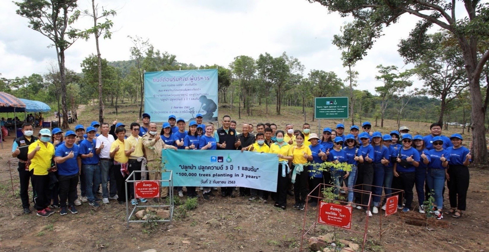 3 กันยายน 2563 : แซลลี่ โอฮาร่า ประธานเจ้าหน้าที่บริหาร บมจ.กรุงไทย-แอกซ่า ประกันชีวิต (คนซ้าย) พร้อมผู้บริหารระดับสูง พนักงานจิตอาสา ตัวแทน และชุมชน ร่วมปลูกต้นไม้ จำนวน 60,000 ต้น ภายใต้โครงการ “ปลูกป่า ปลูกความดี 3 ปี 100,000 ต้น” ครั้งที่ 2 ณ พื้นที่เครือข่ายอนุรักษ์ทรัพยากร “วัดภูยอดรวย” จ. อุบลราชธานี