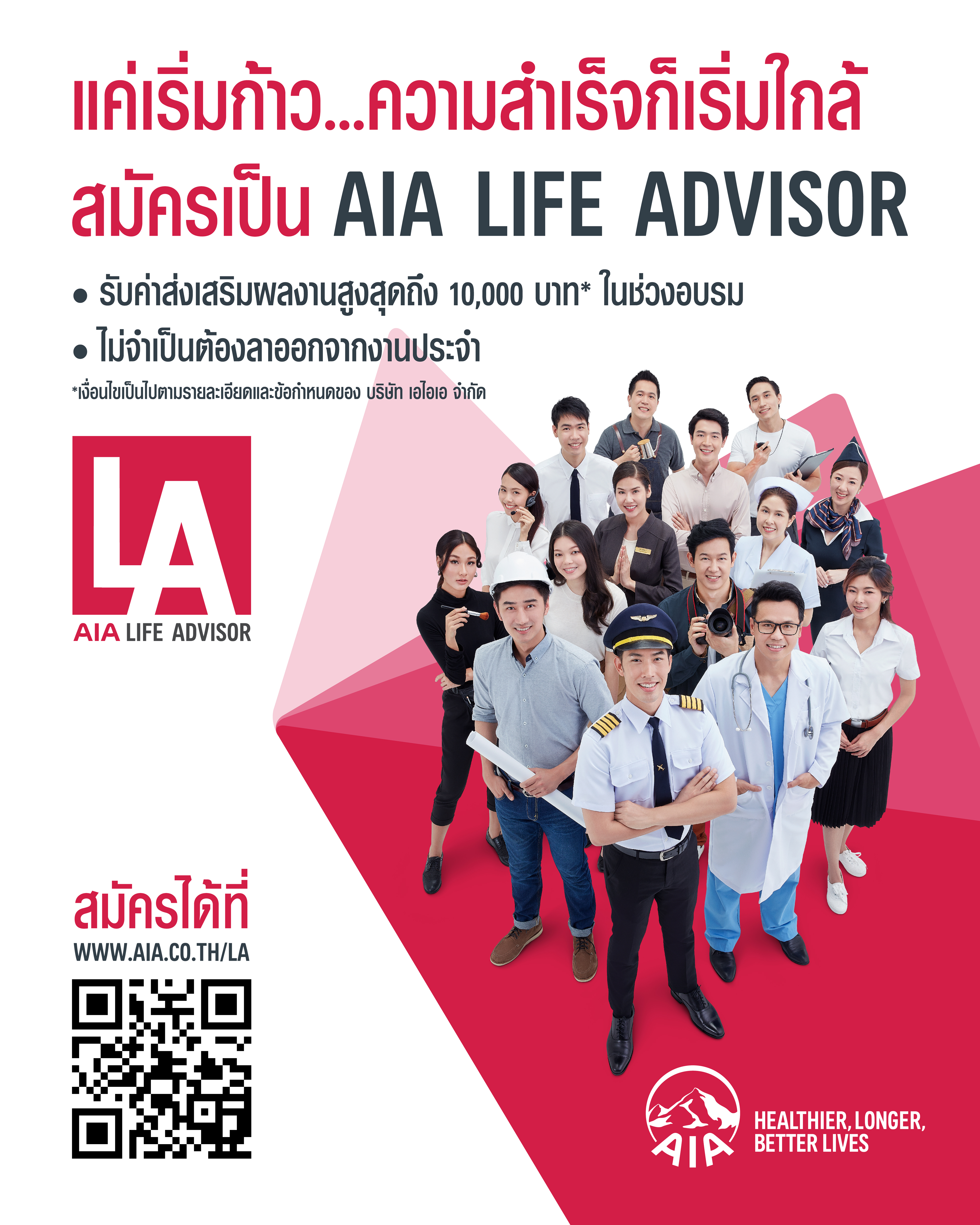 เอไอเอ ประเทศไทย ทั้งนี้ โปรแกรม AIA Life Advisor เหมาะสำหรับนักศึกษาจบใหม่ คนที่ไม่มีงานประจำ คนที่กำลังหางาน หรือต้องการหารายได้เสริม โดยผู้สมัครต้องมีอายุ 20 – 45 ปี และยังไม่เคยออกรหัสกับ AIA มาก่อน มีวุฒิการศึกษาระดับอนุปริญญาขึ้นไป หรือวุฒิม.6 พร้อมมีประสบการณ์การทำงานอย่างน้อย 1 ปี ยิ่งไปกว่านั้น โปรแกรมดังกล่าวได้ถูกออกแบบมาเพื่อเสริมสร้างลักษณะนิสัยตัวแทนใหม่ให้ทำงานอย่างเป็นระบบและสม่ำเสมอ รวมถึงเพื่อเสริมสร้างกำลังพลเพื่อการเติบโตของบริษัท อย่างยั่งยืนในครึ่งปีหลังและในอนาคต”