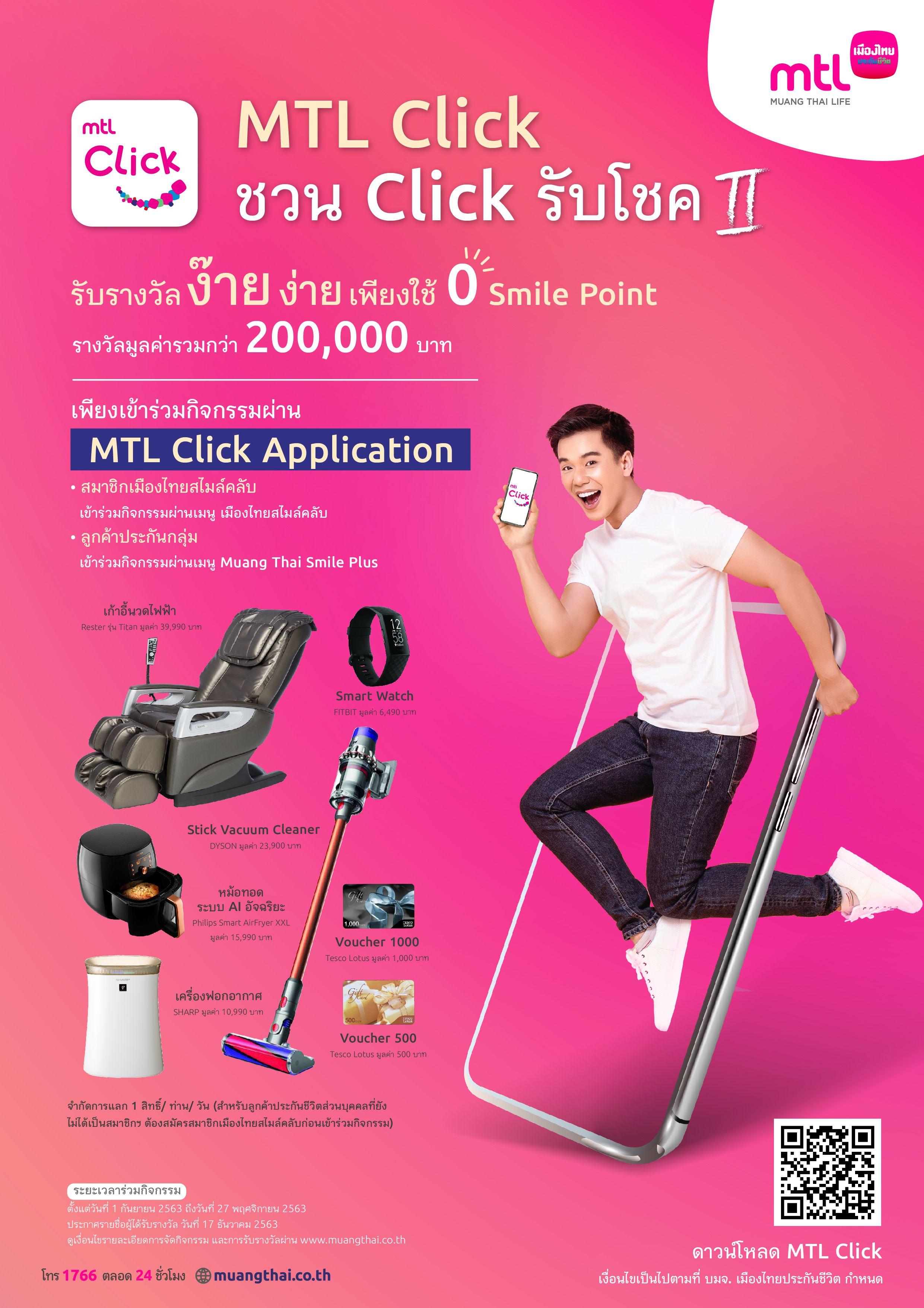 สำหรับลูกค้าประกันกลุ่มแลกคะแนนสะสมได้ที่เมนู Muang Thai Smile Plus (สำหรับลูกค้าประกันกลุ่มสามารถเข้าร่วมได้โดยไม่ต้องเป็นสมาชิกเมืองไทยสไมล์คลับ) ซึ่งจะได้สิทธิ์รับรางวัลรวมมูลค่ากว่า 200,000 บาท โดยสามารถกดแลกคะแนนสะสมได้ทุกวัน (จำกัดการแลก 1 สิทธิ์/ท่าน/วัน) ตั้งแต่วันที่ 1 กันยายน – 27 พฤศจิกายน 2563 และประกาศผลวันที่ 17 ธันวาคม 2563 ดูเงื่อนไขรายละเอียดการจัดกิจกรรม และการรับรางวัลที่ www.muangthai.co.th