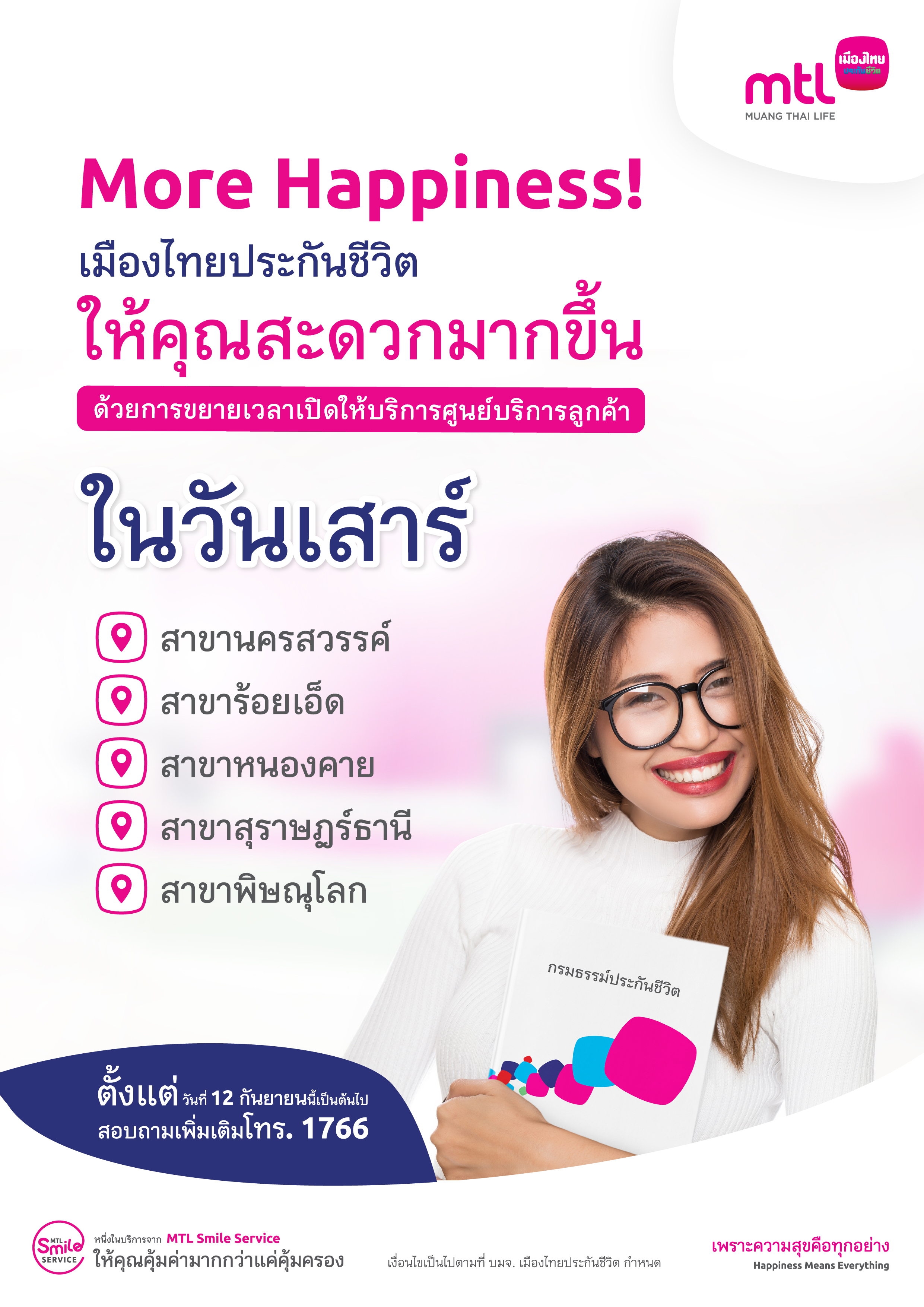10 กันยายน 2563 : นายสาระ ล่ำซำ กรรมการผู้จัดการและประธานเจ้าหน้าที่บริหาร บริษัท เมืองไทยประกันชีวิต จำกัด (มหาชน) เปิดเผยว่า เพื่อเป็นการตอกย้ำนโยบาย “MTL Everyday Life Partner” ที่พร้อมเดินเคียงข้างในทุกช่วงของชีวิต ด้วยการพัฒนาผลิตภัณฑ์และบริการที่สามารถตอบโจทย์ความต้องการในทุกไลฟ์สไตล์ ล่าสุด เมืองไทยประกันชีวิต ได้ขยายวันเปิดให้บริการศูนย์บริการลูกค้าเมืองไทยประกันชีวิต (ประเภทอาคารสำนักงาน) จำนวน 5 สาขา เพื่อให้บริการในวันเสาร์เพิ่มอีก 1 วันทำการ ตั้งแต่เวลา 08.30 น – 17.30 น. เป็นการอำนวยความสะดวกให้กับลูกค้าในการใช้บริการได้มากยิ่งขึ้น