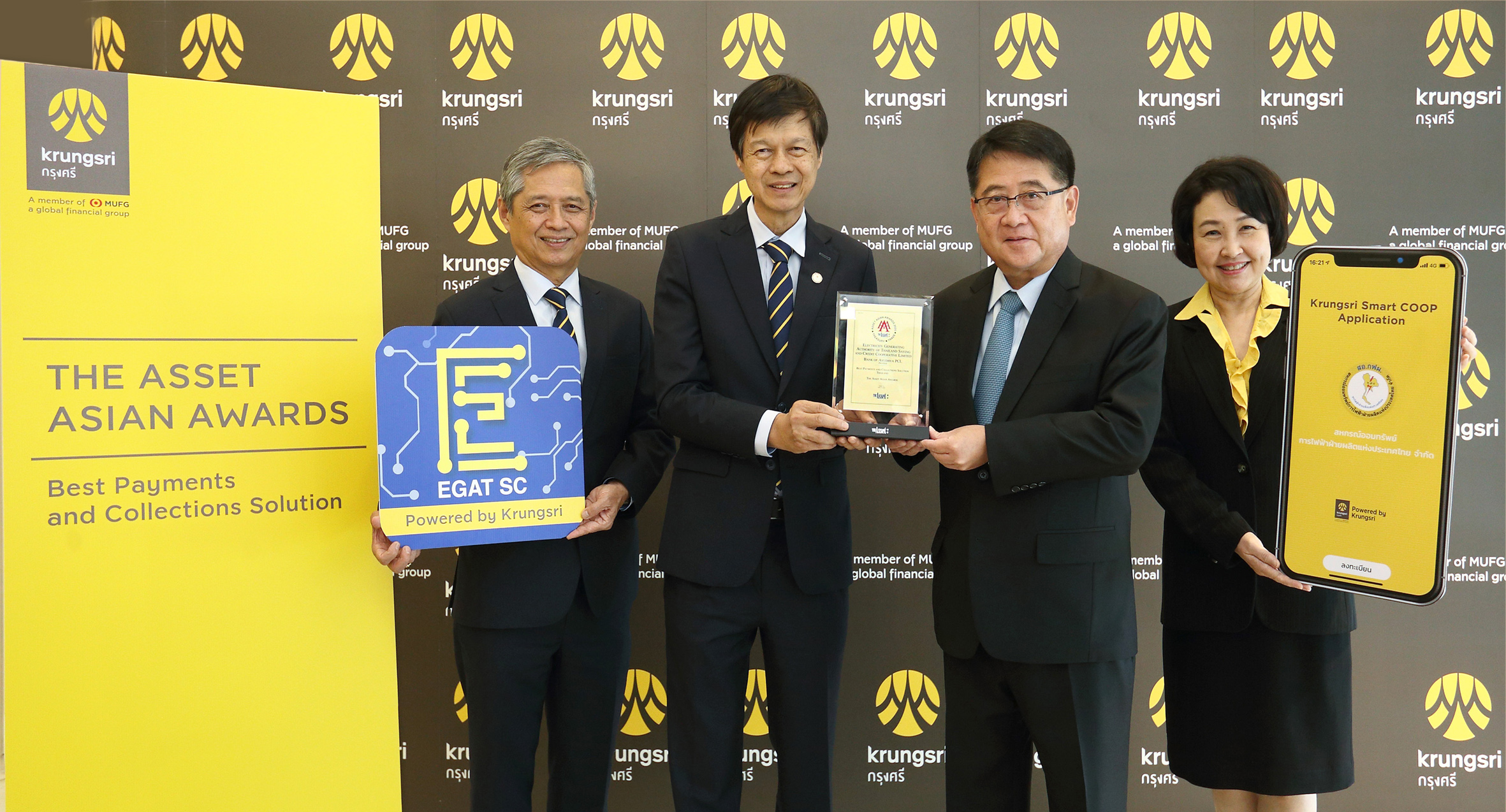 กรุงเทพฯ 11 กันยายน 2563 : พรสนอง ตู้จินดา (ที่ 2 จากขวา) ประธานกลุ่มธุรกิจลูกค้าธุรกิจ ธนาคารกรุงศรีอยุธยา จำกัด (มหาชน) และ ชาติชาย โรจนรัตนางกูร (ที่ 2 จากซ้าย) รองประธานกรรมการ สหกรณ์ออมทรัพย์การไฟฟ้าฝ่ายผลิตแห่งประเทศไทย จำกัด (สอ. กฟผ.) รับรางวัล “Best Payments and Collections Solution in Thailand” จากงาน The Asset Asian Awards 2020 ด้วยความสำเร็จในการพัฒนาแอปพลิเคชั่น “Krungsri Smart COOP” นวัตกรรมการเงินที่ตอบโจทย์ ความต้องการของลูกค้าสหกรณ์ออมทรัพย์การไฟฟ้าฝ่ายผลิตแห่งประเทศไทยให้สามารถทำธุรกรรม ฝาก ถอน โอน และเช็คข้อมูลในบัญชีได้เรียลไทม์