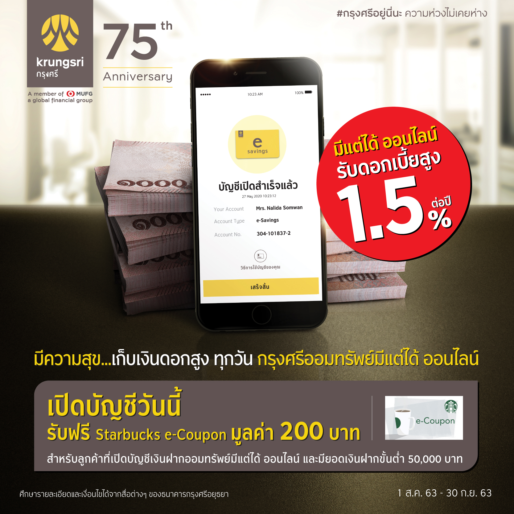 โปรโมชั่นพิเศษสำหรับลูกค้าที่เปิดบัญชีเงินฝากออมทรัพย์มีแต่ได้ ออนไลน์ และมียอดเงินฝากขั้นต่ำ 50,000 บาท รับฟรี Starbucks e-Coupon มูลค่า 200 บาท ตั้งแต่วันนี้ ถึง 30 กันยายน 2563 สนใจเปิดบัญชีออนไลน์ได้แล้วที่ KMA (Krungsri Mobile App) สามารถดาวน์โหลดแอปพลิเคชัน KMA ผ่านทาง App Store หรือ Google Play ดูรายละเอียดเพิ่มเติมได้ที่ https://bit.ly/3gVwNSr หรือ www.krungsri.com ![]()