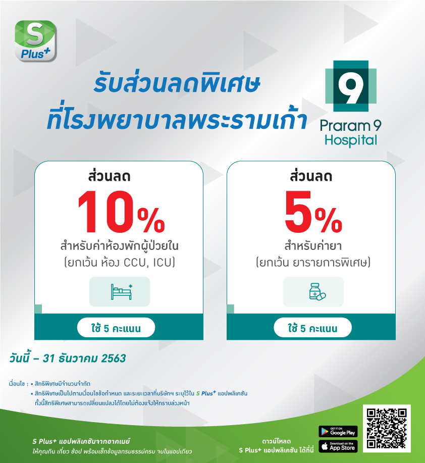 24 กันยายน 2563 : S Plus+ แอปพลิเคชัน โดย อาคเนย์ กลุ่มธุรกิจประกันและการเงิน ห่วงใยสมาชิก จับมือ โรงพยาบาลพระรามเก้า มอบส่วนลดพิเศษ 10% สำหรับห้องพักผู้ป่วยใน (ยกเว้นห้อง CCU, ICU) โดยสมาชิก S PLUS+ ใช้ 5 คะแนนเพื่อแลกรับสิทธิ์ และใช้ 5 คะแนน แลกรับส่วนลด 5% สำหรับค่ายา (ยกเว้นยารายการพิเศษ) ตั้งแต่วันนี้ – 31 ธ.ค. 63