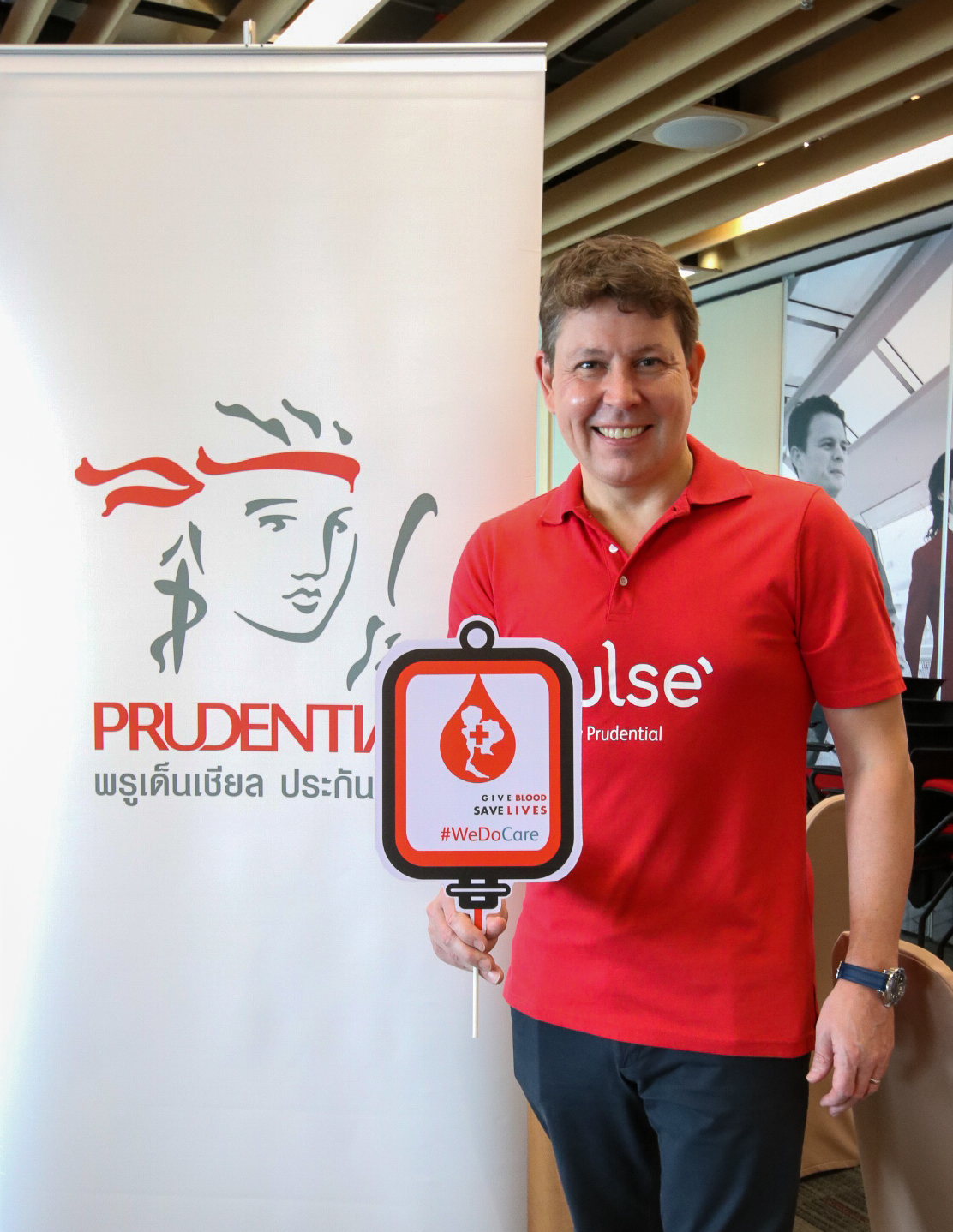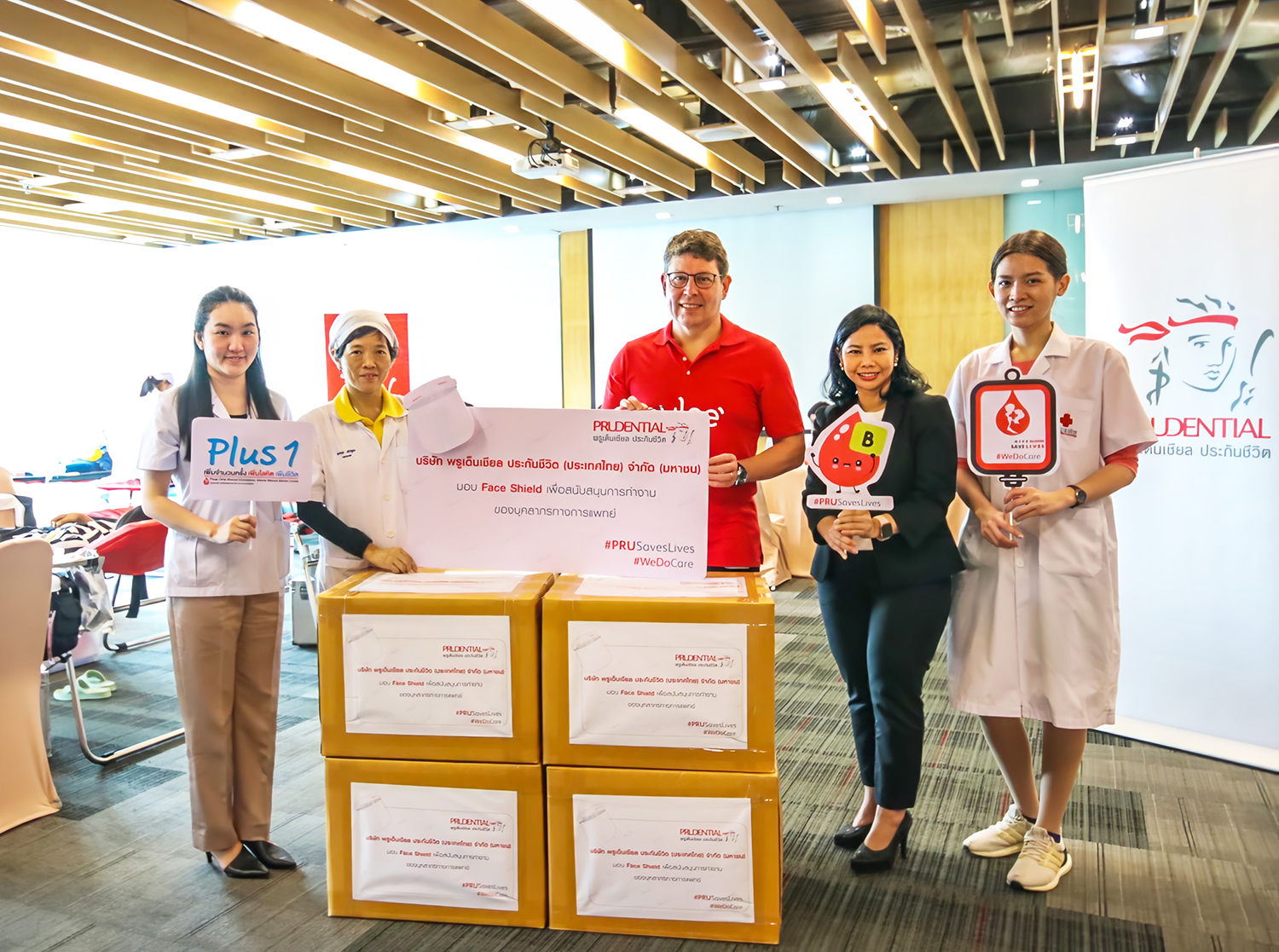24 กันยายน 2563 : บริษัท พรูเด็นเชียล ประกันชีวิต (ประเทศไทย) จำกัด (มหาชน) (“พรูเด็นเชียล ประเทศไทย”) ร่วมบริจาคโลหิต จำนวน 33,750 ซีซี พร้อมมอบหน้ากาก Face Shield ที่พนักงานจิตอาสาจากทุกหน่วยงานในองค์กรร่วมกันทำขึ้น จำนวน 2,500 ชิ้น ให้แก่สภากาชาดไทย เพื่อร่วมสนับสนุนด้านอุปกรณ์ และสิ่งของจำเป็นทางการแพทย์ ที่จำเป็นต่องานป้องกันการแพร่ระบาดของเชื้อไวรัสโควิด-19 ซึ่งกิจกรรมนี้จัดขึ้นเมื่อต้นเดือนกันยายนที่ผ่านมา นำโดยนายโรบิน สเปนเซอร์ (ที่ 3 จากขวา) ประธานเจ้าหน้าที่บริหาร พรูเด็นเชียล ประเทศไทย และนางสาวเปสลารี ธีระสาสน์ (ที่ 2 จากขวา) ประธานเจ้าหน้าที่บริหาร สายงานลูกค้า พรูเด็นเชียล ประเทศไทย โดยมีตัวแทนจากบุคลากรทางการแพทย์ที่เสียสละทุ่มเททั้งแรงกายแรงใจในการต่อสู้และป้องกัน พร้อมทั้งดูแลรักษาผู้ป่วยติดเชื้อไวรัสโควิด-19 เป็นผู้รับมอบ ณ สำนักงานใหญ่ พรูเด็นเชียล ประเทศไทย เขตสาทร กรุงเทพมหานคร ![]()