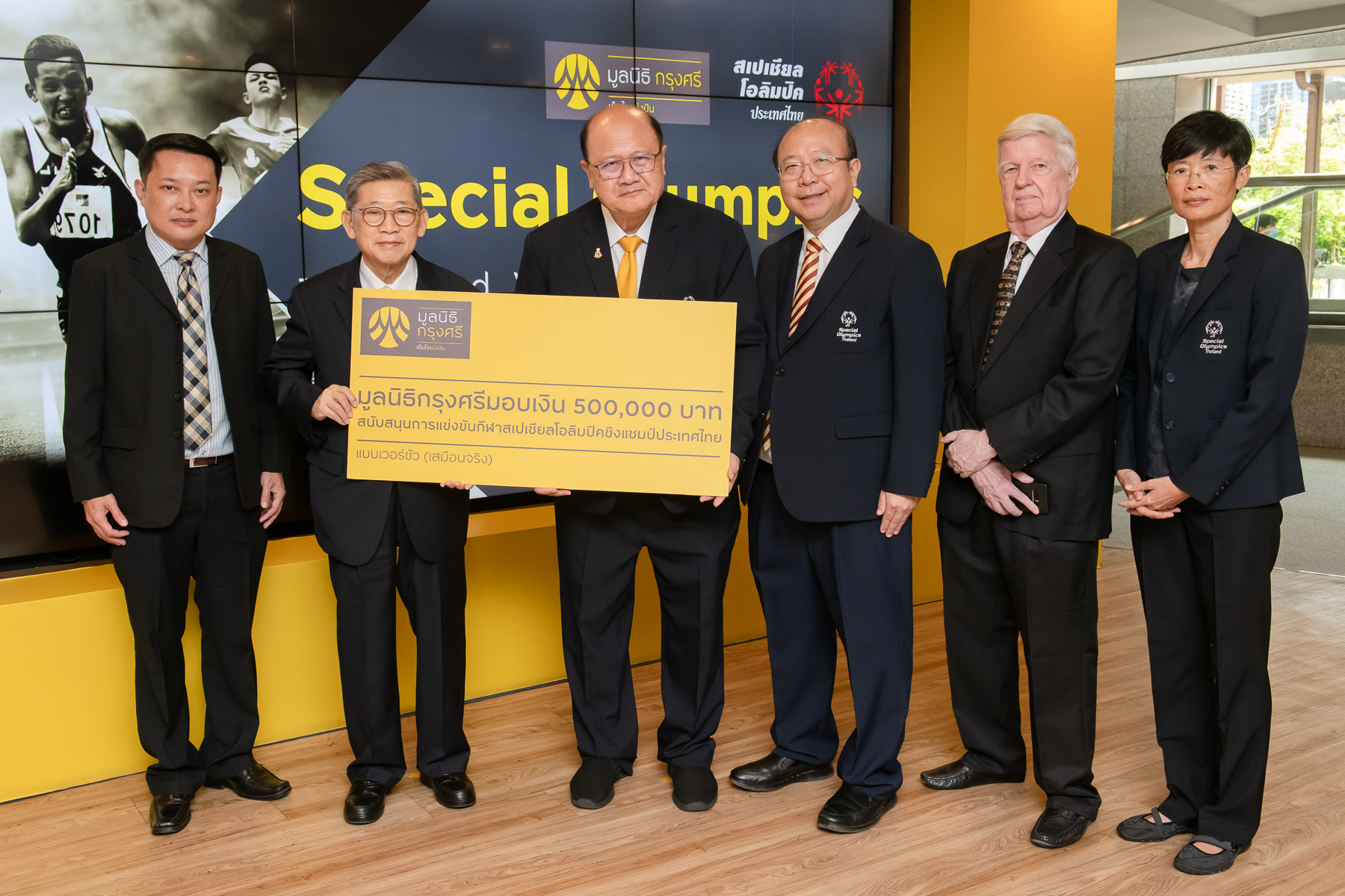 กรุงเทพฯ 24 กันยายน 2563 : การุณ กิตติสถาพร (ที่ 2 จากซ้าย) ประธานมูลนิธิกรุงศรี มอบเงินสนับสนุนการจัดการแข่งขันกีฬาสเปเชียลโอลิมปิคชิงแชมป์แห่งประเทศไทยแบบเสมือนจริง ประจำปี 2563 (Special Olympics Thailand Virtual Games 2020) โดยมี ดร. นริศ ชัยสูตร (ที่ 3 จากซ้าย) นายกสมาคมกีฬาสเปเชียลโอลิมปิคแห่งประเทศไทย เป็นผู้รับมอบเพื่อใช้ในการจัดการแข่งขันกีฬาสำหรับ ผู้พิการทางปัญญา