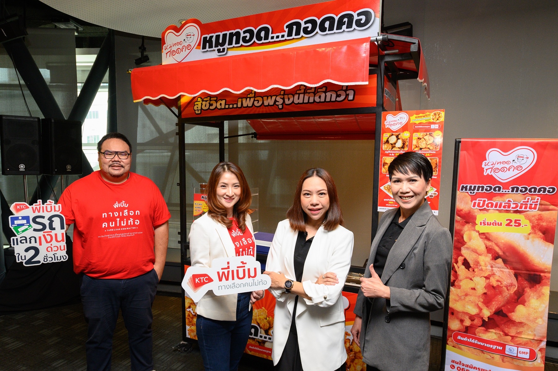 7 ตุลาคม 2563 : นางสาวเรือนแก้ว เกษมสวัสดิ์ศรี (กลางซ้าย) ผู้อำนวยการ – ธุรกิจสินเชื่อ “เคทีซี พี่เบิ้ม” บมจ. บัตรกรุงไทย ร่วมกับ นางสาวชาตยา สุพรรณพงศ์ (กลางขวา) ประธานเจ้าหน้าที่บริหาร บริษัท ฟู้ดแพชชั่น จำกัด สนับสนุนให้คนไทยลุกขึ้นมาใช้ชีวิตไปต่อในช่วงที่เศรษฐกิจไทยกำลังวิกฤติ โดยนำเสนอสินเชื่อทะเบียนรถยนต์ “เคทีซี พี่เบิ้ม” เป็นทางเลือกให้คนไทยที่ไม่ท้อและต้องการเป็นเจ้าของกิจการแฟรนไชส์ “หมูทอดกอดคอ” เข้าถึงแหล่งเงินทุนอย่างถูกต้อง โปร่งใสและเป็นธรรม ด้วยอัตราดอกเบี้ย 24% ต่อปี แบบลดต้นลดดอก อนุมัติและรู้ผลใน 2 ชั่วโมง