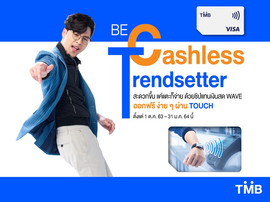 12 ตุลาคม 2563 : ทีเอ็มบี ชวนลูกค้าบัญชีออลล์ฟรี (ALL FREE) ร่วมสร้างเทรนด์การใช้จ่ายแบบไร้เงินสด ให้ทุกการใช้จ่ายสะดวกขึ้นกว่าเดิม ด้วย “ชิปแทนเงินสดWAVE” นวัตกรรมการชำระเงินรูปแบบใหม่เพียงแตะชิปแทนเงินสด WAVE กับเครื่องรับชำระเงินที่มีสัญลักษณ์ VISA payWave ทั่วโลก ก็สามารถชำระค่าสินค้าได้ทันที ไม่ต้องมีลายเซ็น หรือ PIN และยังปลอดภัย มี SMS เตือนทุกการใช้จ่าย โดยลูกค้าบัญชีออลล์ฟรี สามารถขอออกชิปแทนเงินสด WAVE ได้ ฟรี! ผ่านแอปพลิเคชัน TOUCH และธนาคารจะจัดส่งให้ถึงบ้าน หรือ ติดต่อที่สาขาทีเอ็มบี (เฉพาะ 35 สาขา) ตั้งแต่วันนี้ ถึง 31 มกราคม 2564