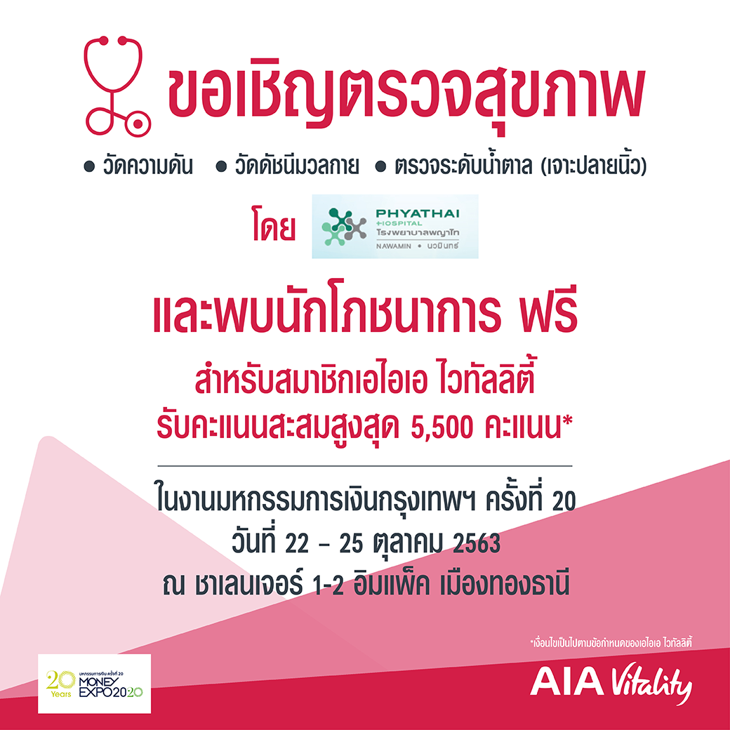 พบกับแบบประกันที่พร้อมตอบโจทย์ทุกช่วงชีวิต ตรงกับทุกความต้องการและไลฟ์สไตล์ พร้อมรับคำแนะนำจากที่ปรึกษาด้านการประกันชีวิตและการเงินมืออาชีพ ได้ที่ บูธเอไอเอ ในงานมหกรรมการเงิน กรุงเทพฯ ครั้งที่ 20 (Money Expo Bangkok 2020) ระหว่างวันที่ 22 – 25 ตุลาคม 2563 ณ ชาเลนเจอร์ 1-2 อิมแพ็ค เมืองทองธานี ![]()