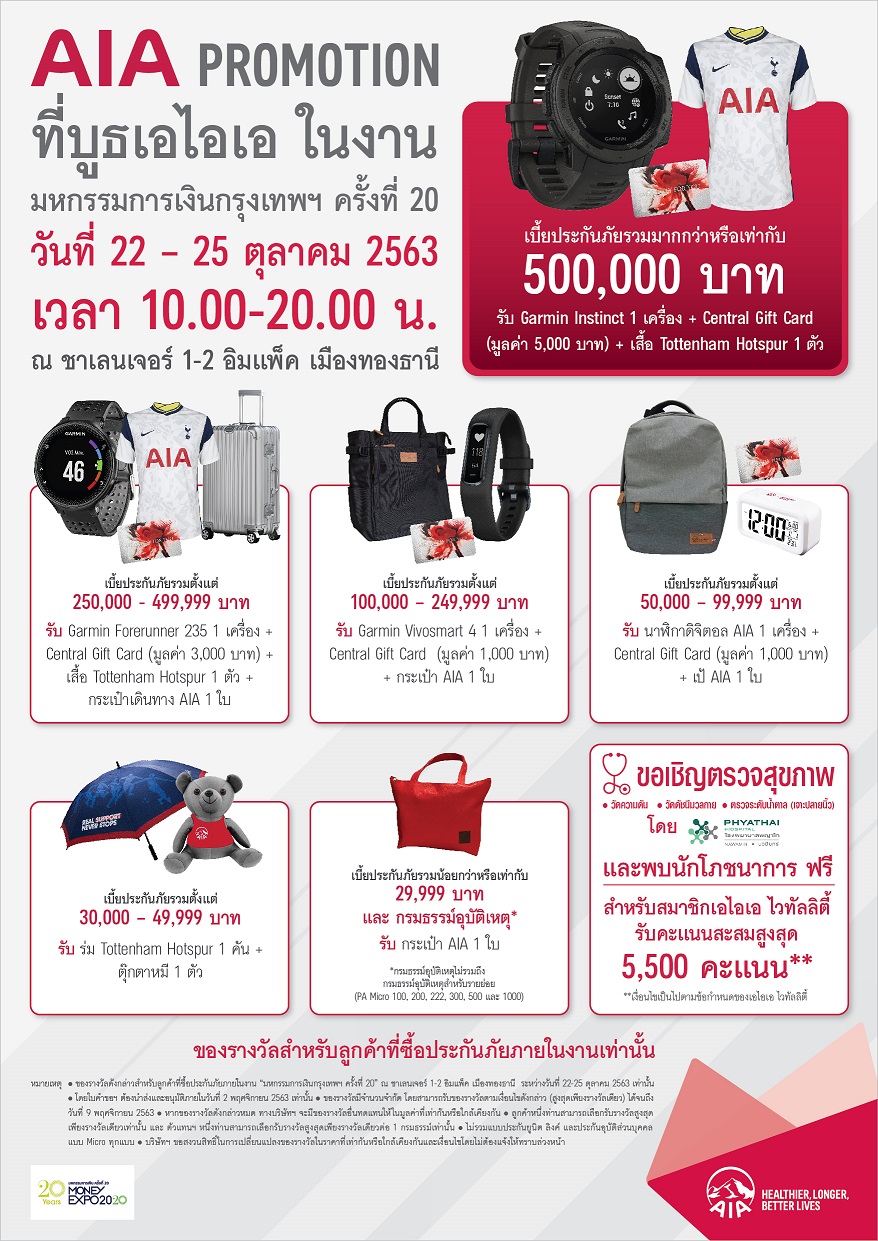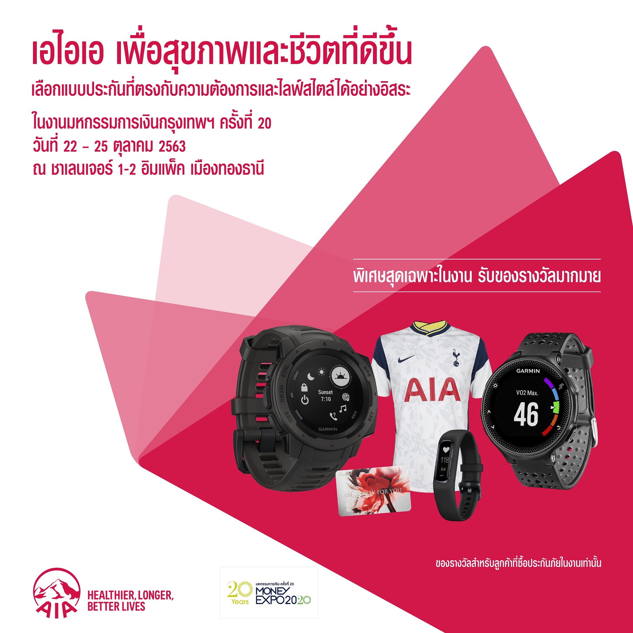 16 ตุลาคม 2563 : เอไอเอ ประเทศไทย ผู้นำในตลาดประกันชีวิตและสุขภาพ ร่วมงานมหกรรมการเงิน กรุงเทพฯ ครั้งที่ 20 (Money Expo Bangkok 2020) ยกขบวนผลิตภัณฑ์หลากหลายประเภท ครอบคลุมทุกความต้องการ เพื่อมุ่งส่งเสริมให้คนไทยตระหนักถึงความสำคัญของการวางแผนคุ้มครองชีวิตและการเงิน เตรียมพร้อมสำหรับเหตุการณ์ที่อาจเกิดขึ้นโดยไม่คาดคิด โดยชูแบบประกันโรคร้ายแรง พร้อมทั้งแบบประกันชีวิตควบการลงทุน (Unit Linked) ที่มีบลจ. เอไอเอ (ประเทศไทย) เป็นผู้บริหารเงินลงทุน ผ่านความเชี่ยวชาญในการบริหารพอร์ตทั้งไทยและต่างประเทศมากว่า 30 ปี
