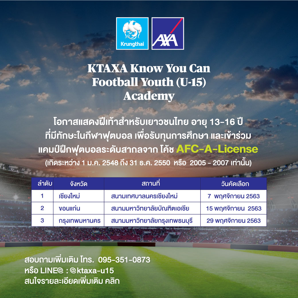19 ตุลาคม 2563 : โอกาสสำหรับเยาวชนไทย ชาย และหญิง อายุ 13 – 16 ปี (เกิดระหว่าง 1 ม.ค. 2548 – 31 ธ.ค. 2550 หรือ ค.ศ. 2005 – 2007)ที่มีทักษะในกีฬาฟุตบอลมาถึงแล้ว “กรุงไทย-แอกซ่า ประกันชีวิต” สานต่อโครงการ “KTAXA Know You Can Football Youth(U15) Academy”ใน 3 สนาม เพื่อคัดเลือกสุดยอดเยาวชนไทยที่มีทักษะในกีฬาฟุตบอล เข้าร่วมแคมป์ฝึกฟุตบอลระดับสากลจากโค้ช AFC-A-License ณ ศูนย์ฝึกฟุตบอลชั้นนำของประเทศ และรับทุนการศึกษาคนละ 5,000 บาท