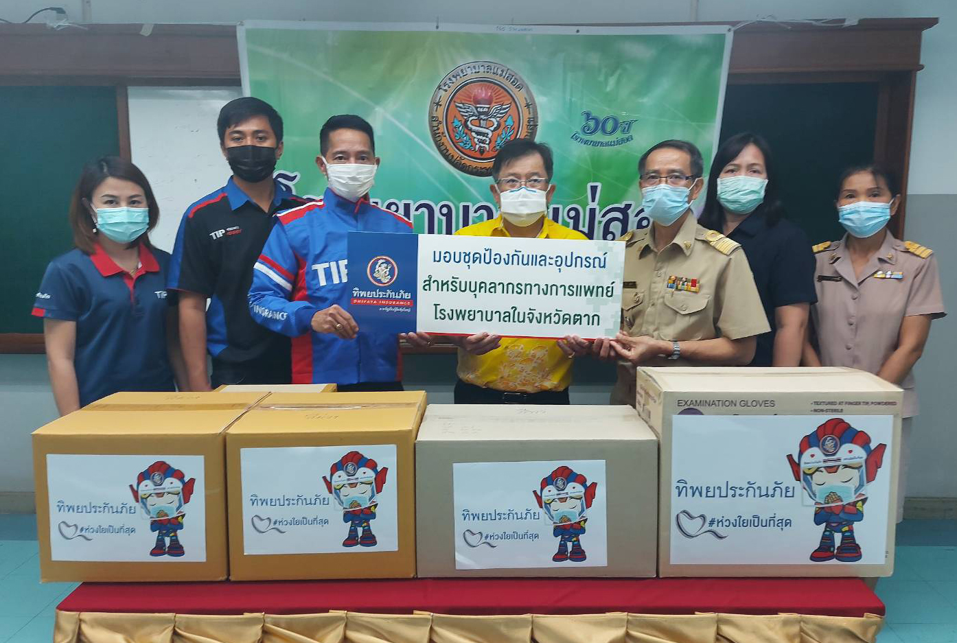 19 ตุลาคม 2563 : ดร.สมพร สืบถวิลกุล กรรมการผู้จัดการใหญ่ ทิพยประกันภัย ส่งทีมหนุมานทิพยจิตอาสา และ TIP Smart Assist ลงพื้นที่ทันที มอบชุด PPE (Personal Protective Equipment) ชุดอุปกรณ์ป้องกันความปลอดภัยส่วนบุคคล ถุงมือ และเจลแอลกอฮอล์ ให้กับบุคลากรทางการแพทย์ โรงพยาบาลแม่สอด จ.ตาก เพื่อความปลอดภัยและป้องกันการติดเชื้อจากการดูแลรักษาผู้ป่วย ตามโครงการ ทิพยประกันภัยห่วงใยทุกชีวิตในสังคม หลังพบว่ามีชาวเมียนมาติดเชื้อโควิด – 19 และส่งตัวเข้ารับการรักษาที่โรงพยาบาลแม่สอด จ.ตาก