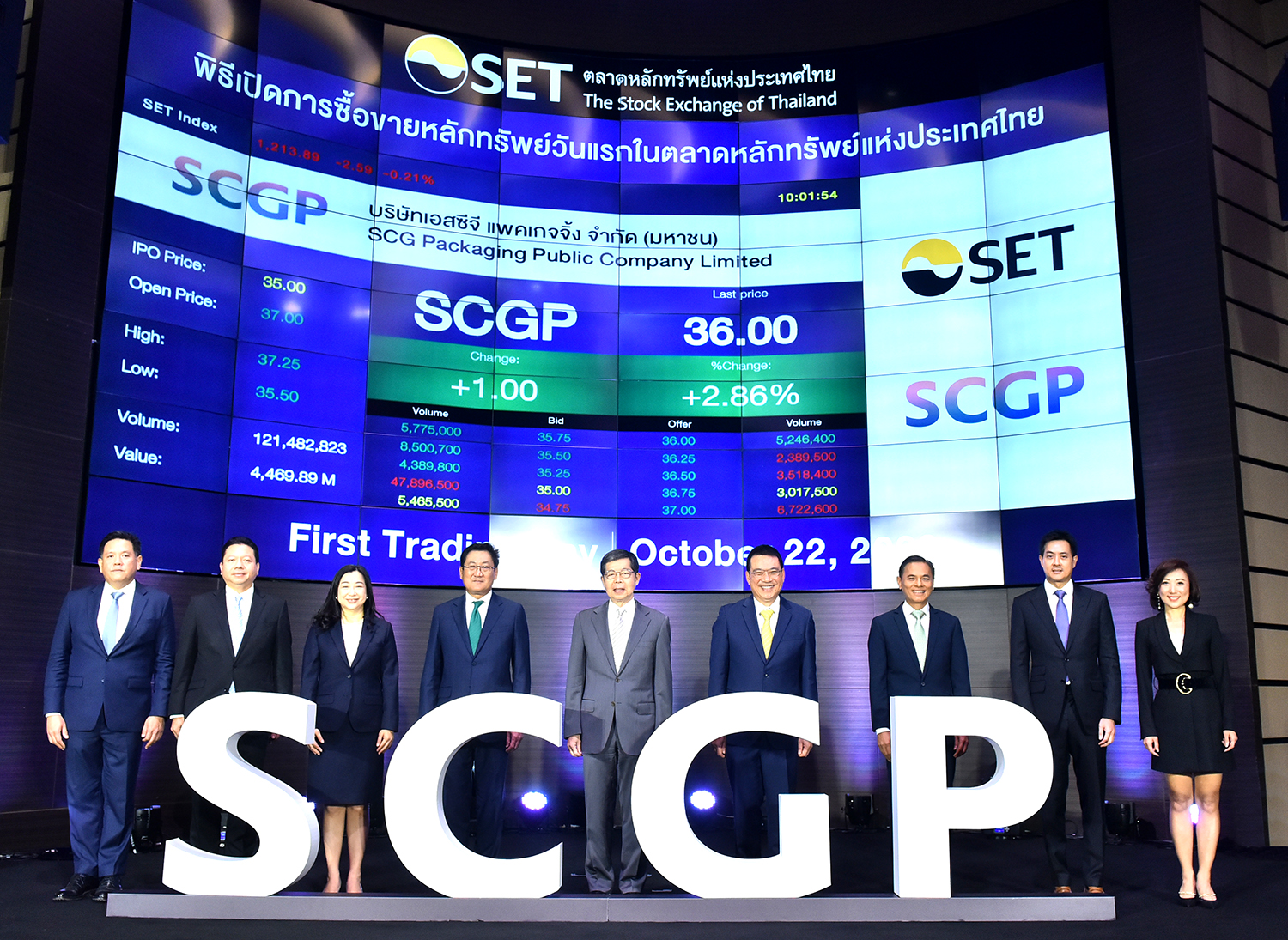 โดยมี ดร.ภากร ปีตธวัชชัย (ที่ 4 จากซ้าย) กรรมการและผู้จัดการ และ แมนพงศ์ เสนาณรงค์ (ซ้ายสุด) รองผู้จัดการ หัวหน้าสายงานผู้ออกหลักทรัพย์ ตลาดหลักทรัพย์แห่งประเทศไทย ร่วมแสดงความยินดี ซึ่งหุ้น SCGP เปิดซื้อขายวันแรกที่ราคาหุ้นละ 37.00 บาท จากราคาจองซื้อ IPO ที่หุ้นละ 35 บาท ![]()