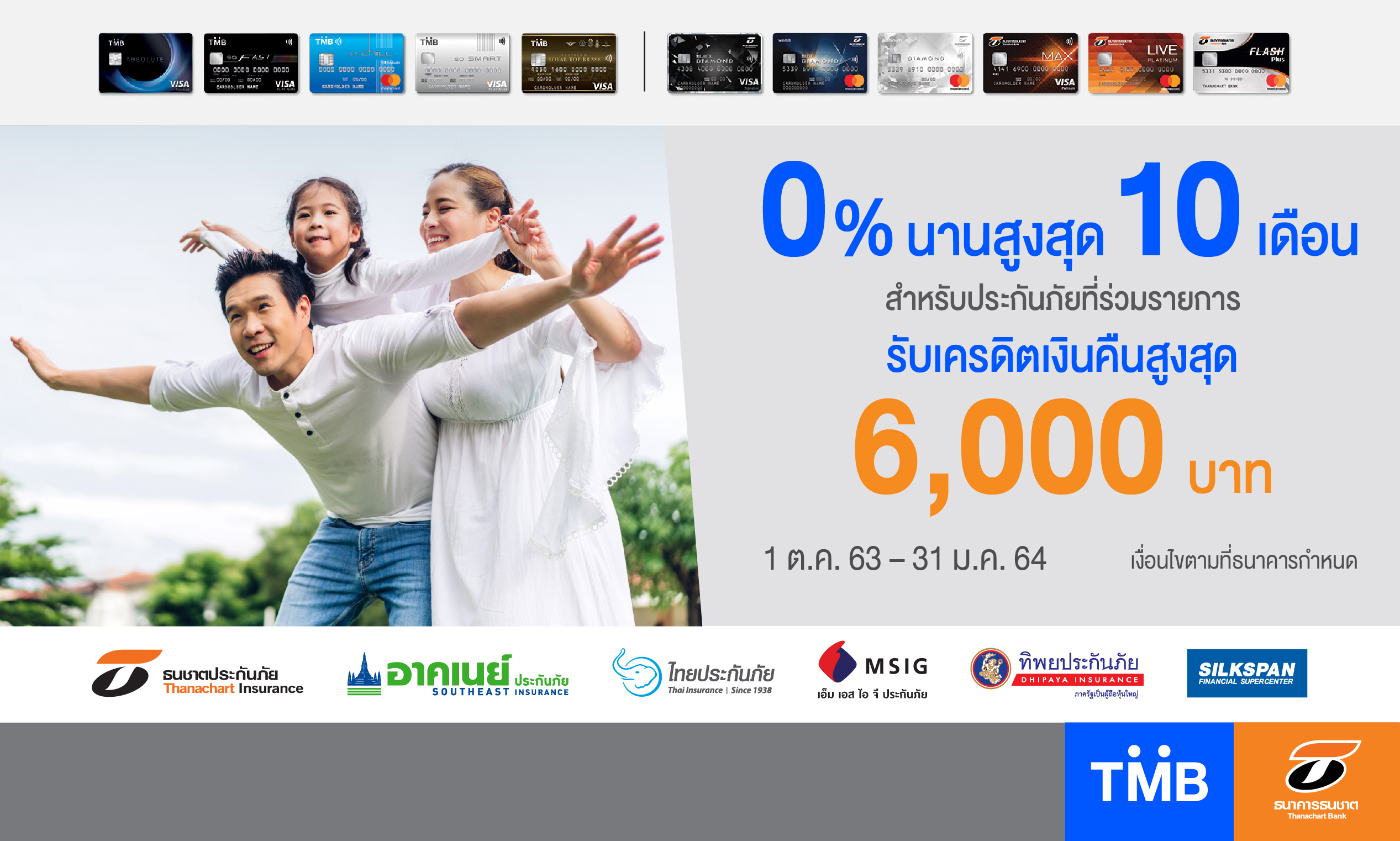 22 ่ตุลาคม 2563 : บัตรเครดิตทีเอ็มบีและบัตรเครดิตธนชาต มอบความอุ่นใจให้ลูกค้าเมื่อซื้อประกันภัยผ่านบัตรเครดิตกับบริษัทประกันภัยที่ร่วมรายการ สามารถแบ่งชำระได้ 0% นานสูงสุด 10 เดือน พร้อมรับเครดิตเงินคืนสูงสุด 6,000 บาท ตั้งแต่วันนี้ – 31 มกราคม 2564 เพียงมียอดใช้จ่าย 8,500 – 14,999 บาท/เซลล์สลิป รับเครดิตเงินคืน 100 บาท/สิทธิ์ ยอดใช้จ่าย 15,000 – 29,999 บาท/เซลล์สลิป รับเครดิตเงินคืน 220 บาท/สิทธิ์ ยอดใช้จ่าย 30,000 บาท ขึ้นไป/เซลล์สลิป รับเครดิตเงินคืน 600 บาท/สิทธิ์