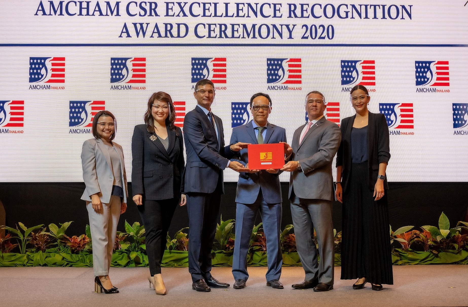 โดยมี เกรกอรี หว่อง (ที่ 3 จากซ้าย) ประธานหอการค้าอเมริกันในประเทศไทย และ นายไมเคิล จอร์จดีซอมบรี (ที่ 2 จากขวา) เอกอัครราชทูตสหรัฐอเมริกาประจำประเทศไทย เป็นผู้มอบรางวัล