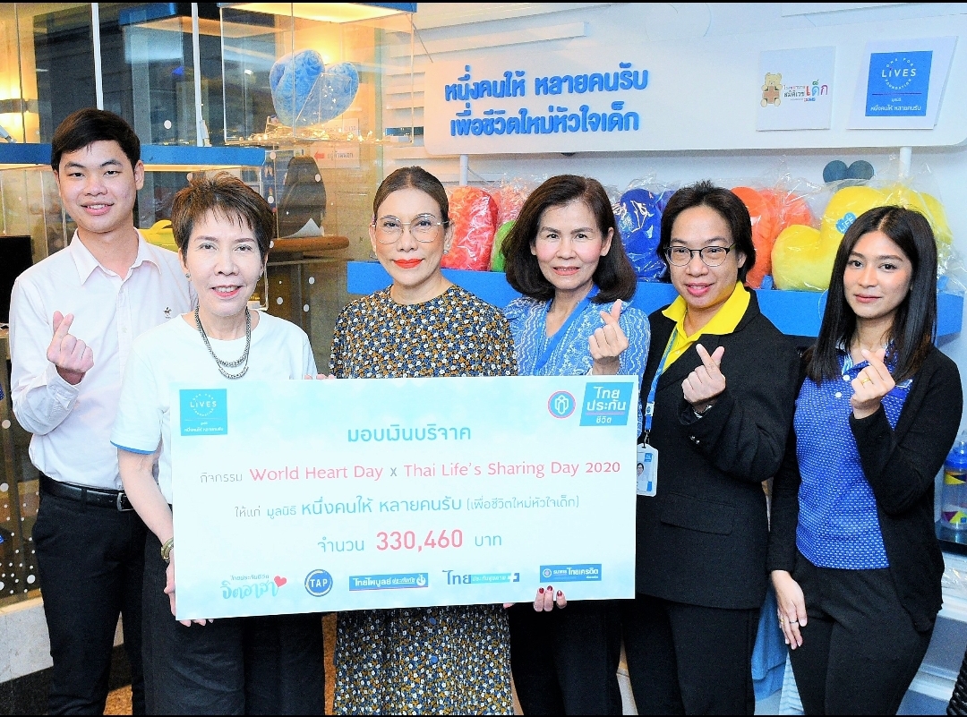 2 พฤศจิกายน 2563 : สิริพร ใจสะอาด ผู้อำนวยการสายงาน สายงานโฆษณา ในฐานะผู้แทน บริษัท ไทยประกันชีวิต จำกัด (มหาชน) ร่วมมอบเงินจำนวน 330,460 บาท จากการจัดกิจกรรม Thai Life’s Sharing Day x World Heart Day 2020 และกิจกรรมระดมทุนทรัพย์ผ่านแคมเปญในช่องทาง Twitter ของบริษัทฯ นำไปสมทบโครงการหนึ่งคนให้ หลายคนรับ เพื่อชีวิตใหม่หัวใจเด็ก โดยมีนางสาวภาสินี ปรีชาธนาพล อนุกรรมการและเลขานุการ มูลนิธิหนึ่งคนให้ หลายคนรับ เป็นผู้รับมอบ ณ ร้าน Give Shop มูลนิธิหนึ่งคนให้ หลายคนรับ ชั้น 1 อาคารไทยประกันชีวิต ![]()