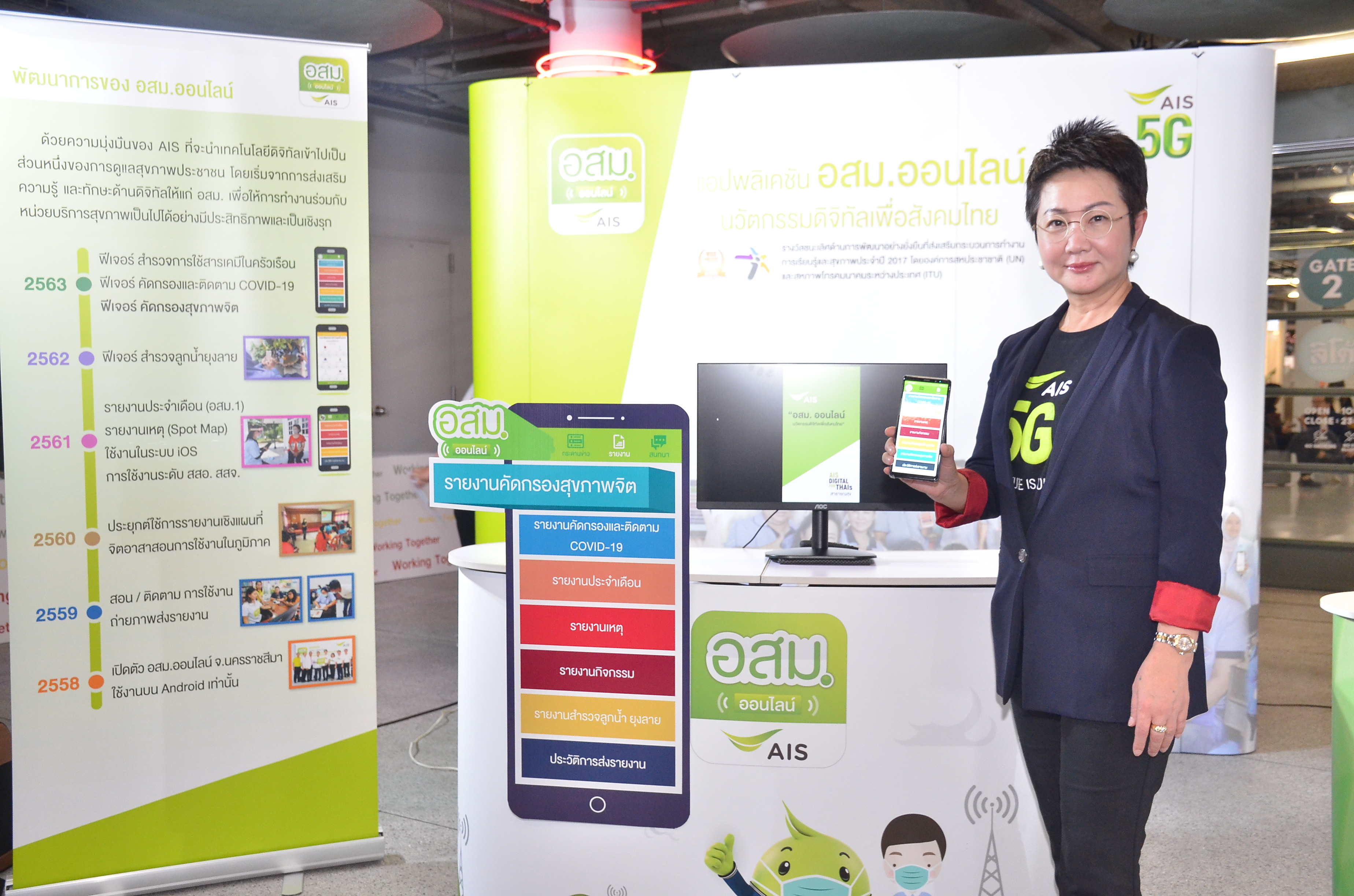 3 พฤศจิกายน 2563 : สานต่อภารกิจ “5G ฟื้นฟูประเทศ” เอไอเอส ผนึกกำลัง กรมสุขภาพจิตและกรมสนับสนุนบริการสุขภาพ อัปเกรดแอปพลิเคชัน อสม. ออนไลน์ เปิดฟีเจอร์ใหม่ “รายงานคัดกรองสุขภาพจิต” เป็นอาวุธคู่กาย อสม. ในการลงพื้นที่เฝ้าระวัง ตรวจคัดกรอง และให้คำแนะนำการปฏิบัติตนสำหรับผู้ที่มีความวิตกกังวล ซึมเศร้าได้ทันที