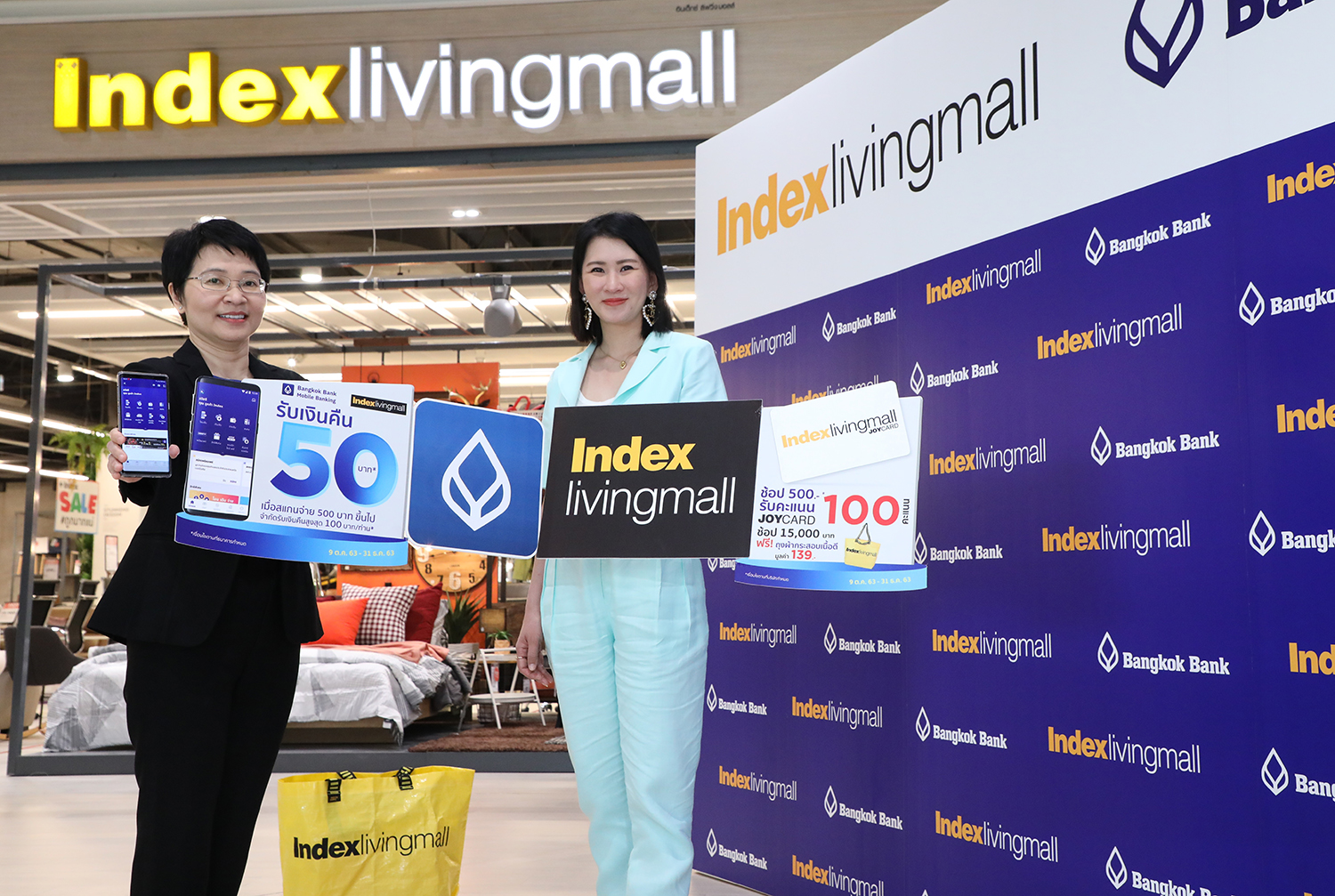 9 พฤศจิกายน 2563 : กฤษชนก ปัทมสัตยาสนธิ กรรมการผู้จัดการ บริษัท อินเด็กซ์ ลิฟวิ่งมอลล์ จำกัด (มหาชน) (Index Living Mall) จับมือกับพันธมิตร ปรัศนี อุยยามะพันธ์ ผู้ช่วยผู้จัดการใหญ่ ธนาคารกรุงเทพ จำกัด (มหาชน) ร่วมเปิดประสบการณ์ช้อปสินค้าเรื่องบ้านที่ดีที่สุดเหนือใคร มอบความ “สะดวก สบาย ปลอดภัย” แบบ Touchless Society (ไร้สัมผัส) ตอบรับไลฟ์สไตล์ชีวิตวิถีใหม่ New Normal ให้ทุกๆ การช้อปเฟอร์นิเจอร์ ของใช้ภายในบ้าน ของตกแต่งบ้าน เครื่องใช้ไฟฟ้า ที่ อินเด็กซ์ ลิฟวิ่งมอลล์ เพียงแค่สแกน QR Code จ่ายผ่าน โมบายแบงก์กิ้งธนาคารกรุงเทพ พร้อมรับสิทธิพิเศษ ! ถึง 3 ต่อ ดังนี้ ต่อที่ 1 รับเงินคืน 50 บาท เมื่อใช้จ่าย 500 บาทขึ้นไป (จำกัดรับเงินคืนสูงสุด 100 บาท), ต่อที่ 2 ช้อป 500 บาท รับคะแนนสะสม Joy Card 100 คะแนน และต่อที่ 3 ช้อป 15,000 บาท รับฟรี! ถุงผ้ากระสอบเนื้อดี มูลค่า 139 บาท ร่วมสัมผัสประสบการณ์ช้อปปุ๊บ สแกนปั๊บ ได้ที่ อินเด็กซ์ ลิฟวิ่งมอลล์ ทุกสาขาทั่วประเทศ ตั้งแต่วันนี้ – 31 ธ.ค.63 ![]()