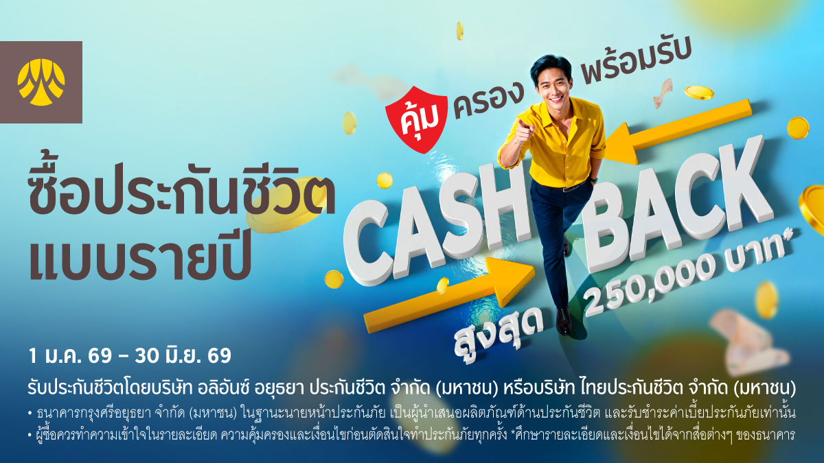 ซื้อประกันชีวิตแบบรายปีผ่านสาขาธนาคารกรุงศรี มั่นใจทุกความคุ้มครอง พร้อมรับเงินคืนสูงสุด 250,000 บาท